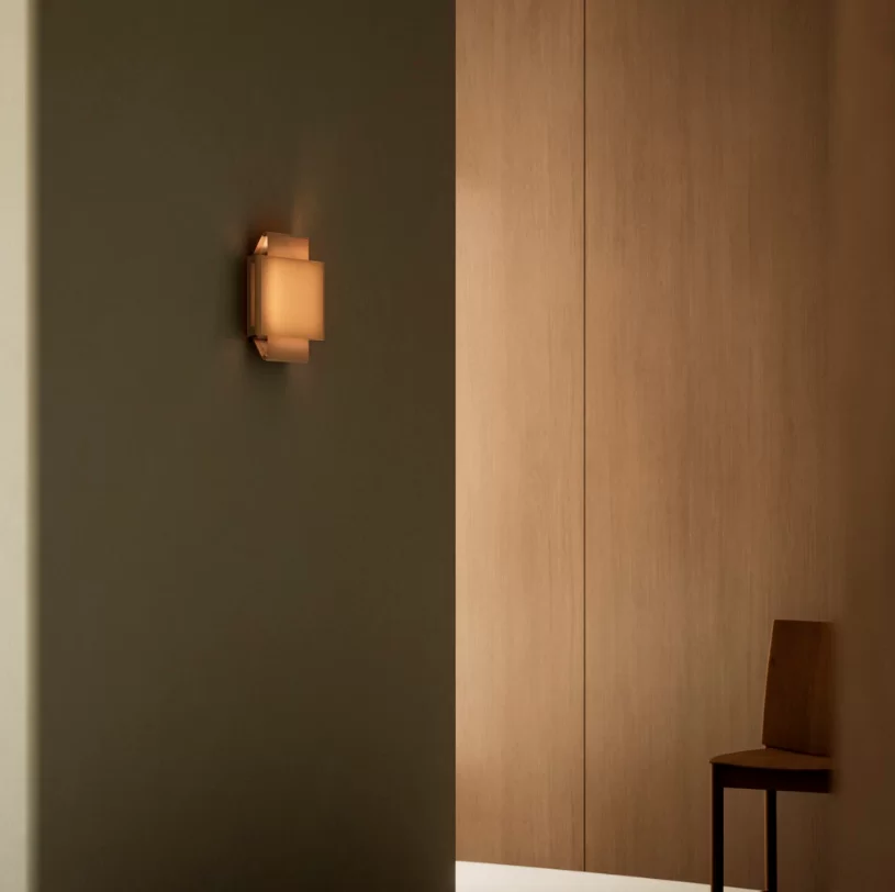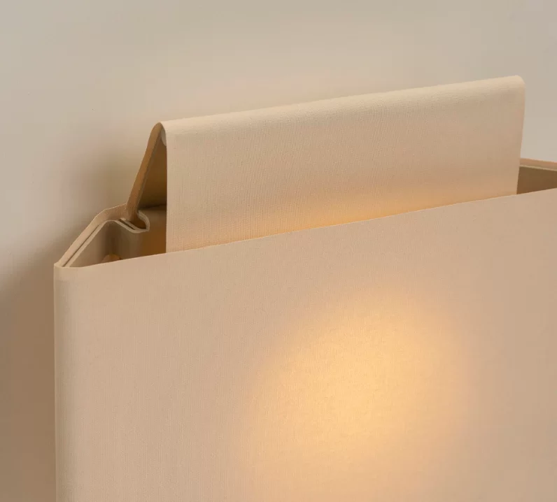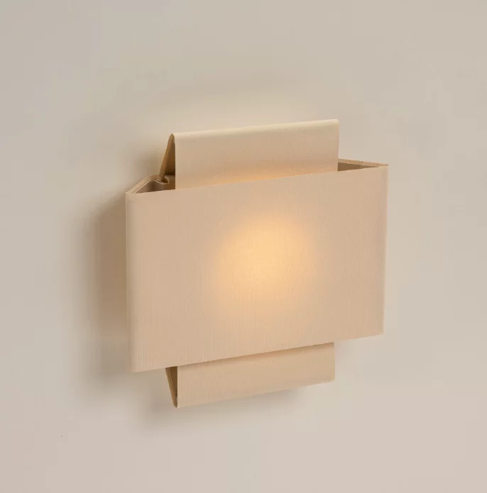 Aplique Aura es una luminaria de luz difusa compuesta por una estructura metálica que tensa dos pantallas textiles entrecruzadas generando un efecto de luz en el centro.