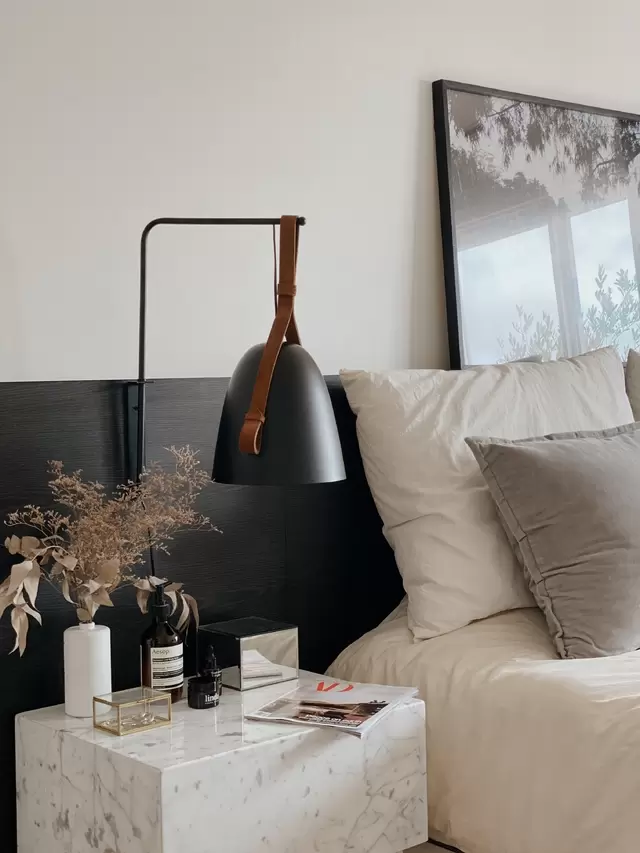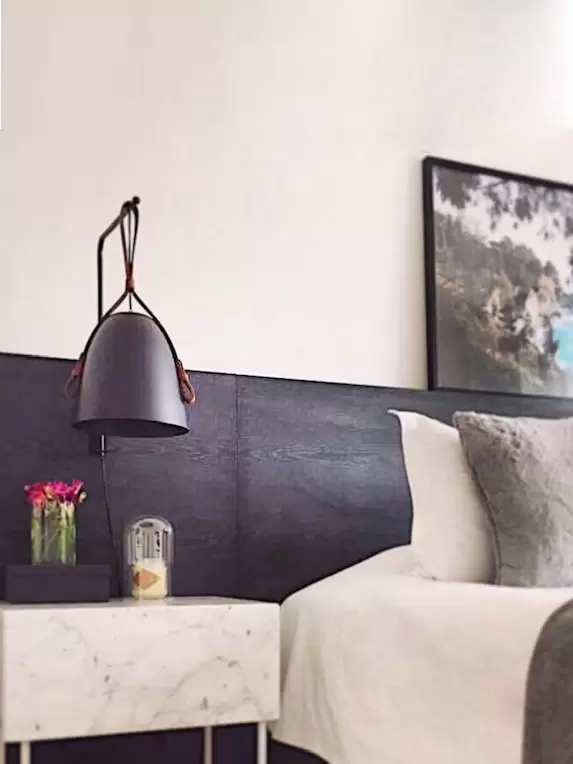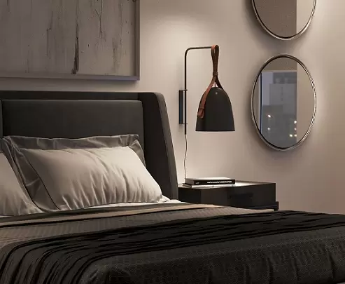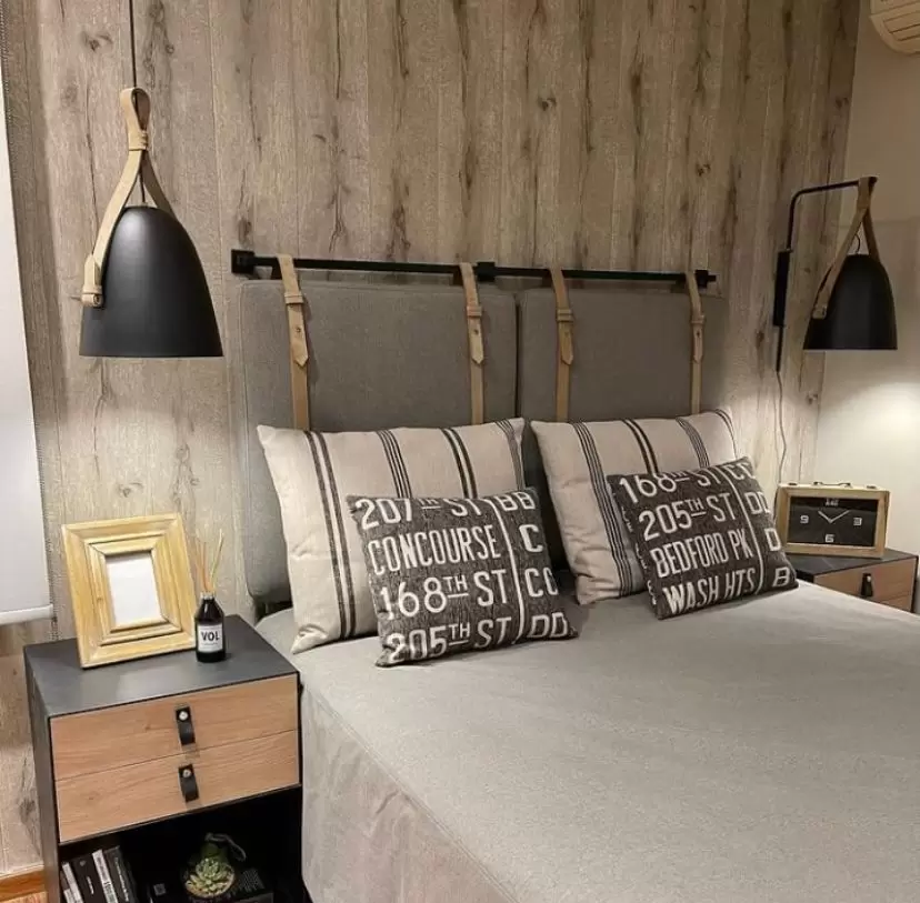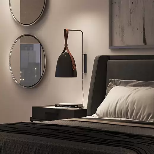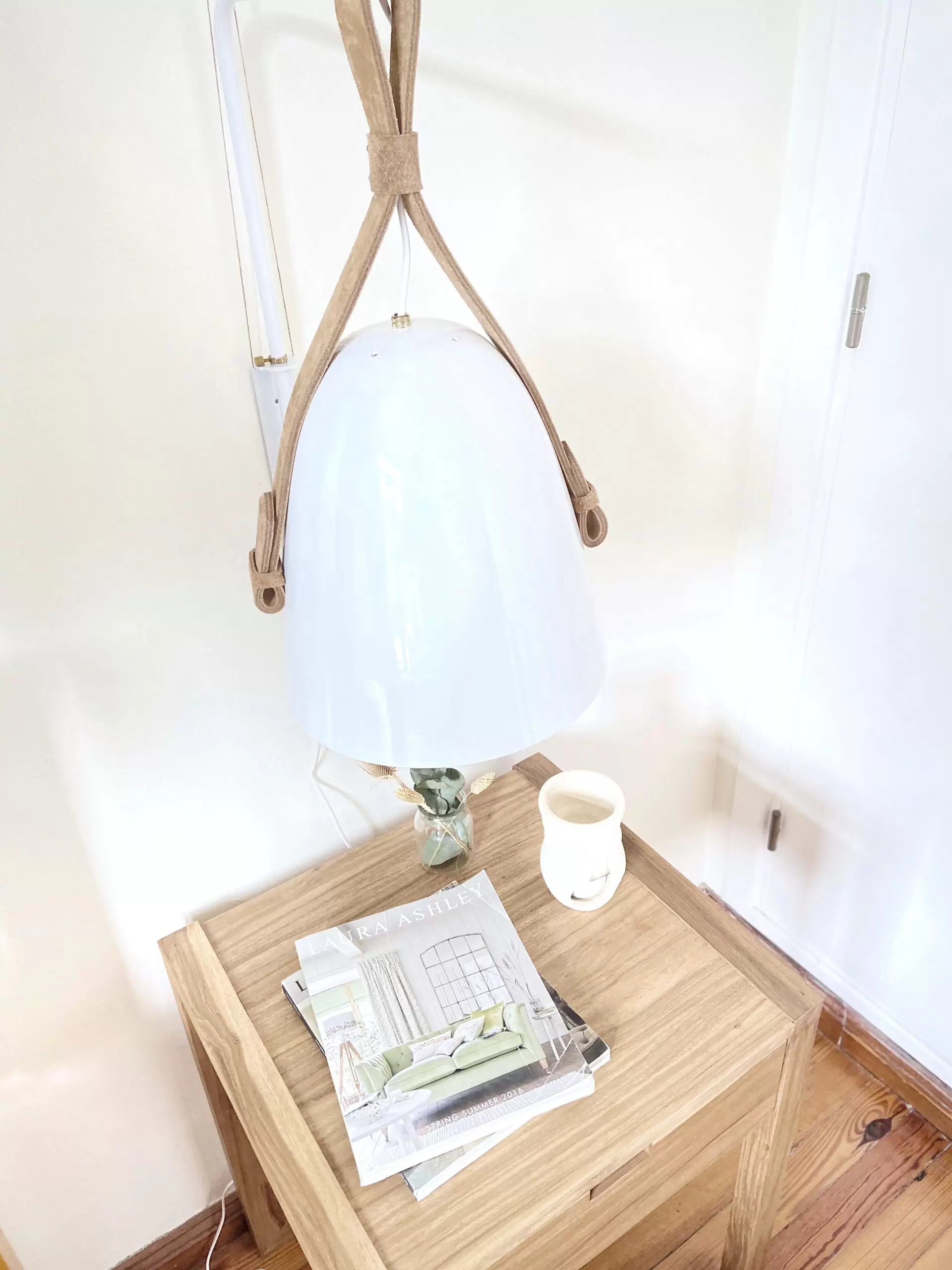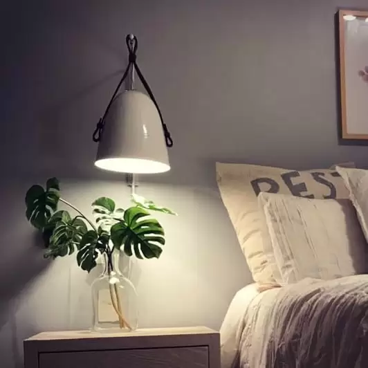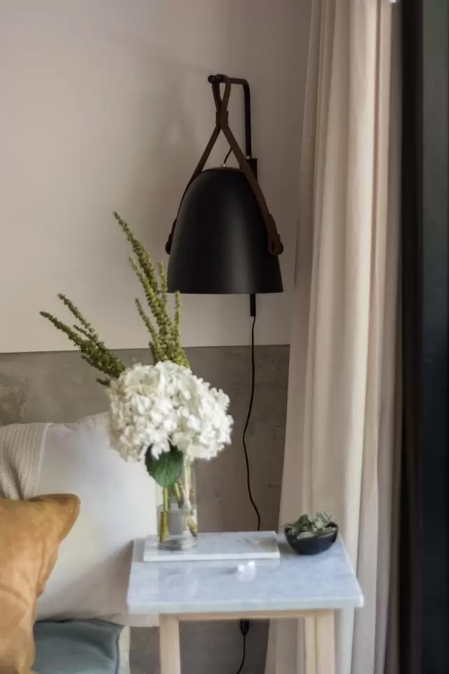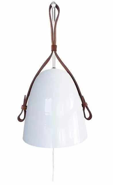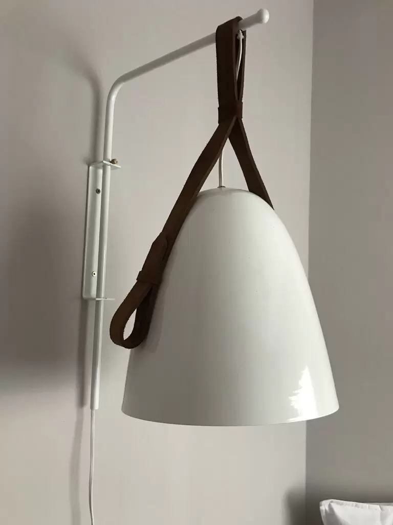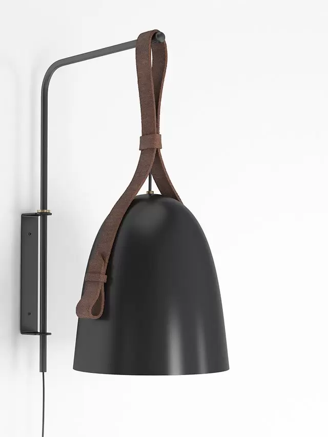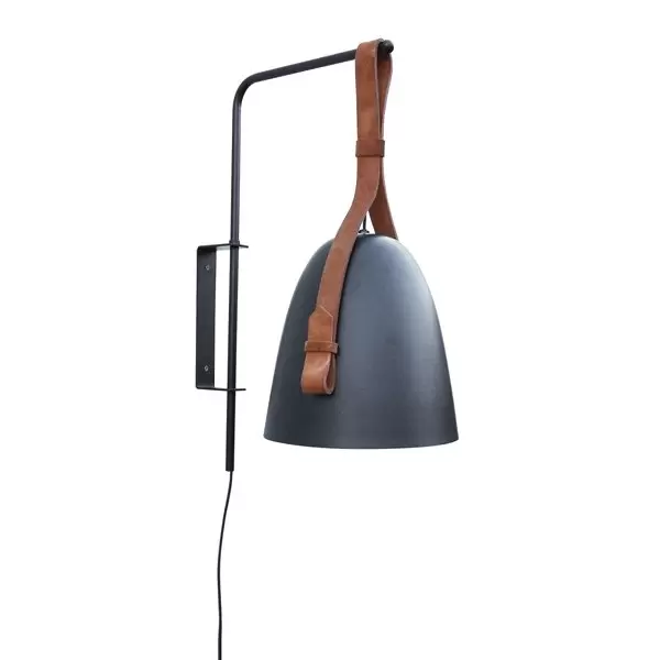 Aplique de pared Viking construida en metal con cabezal suspendido desde un agarra de cuero castaño gamuzado. Ideal para respaldos de cama o espacios de lectura.