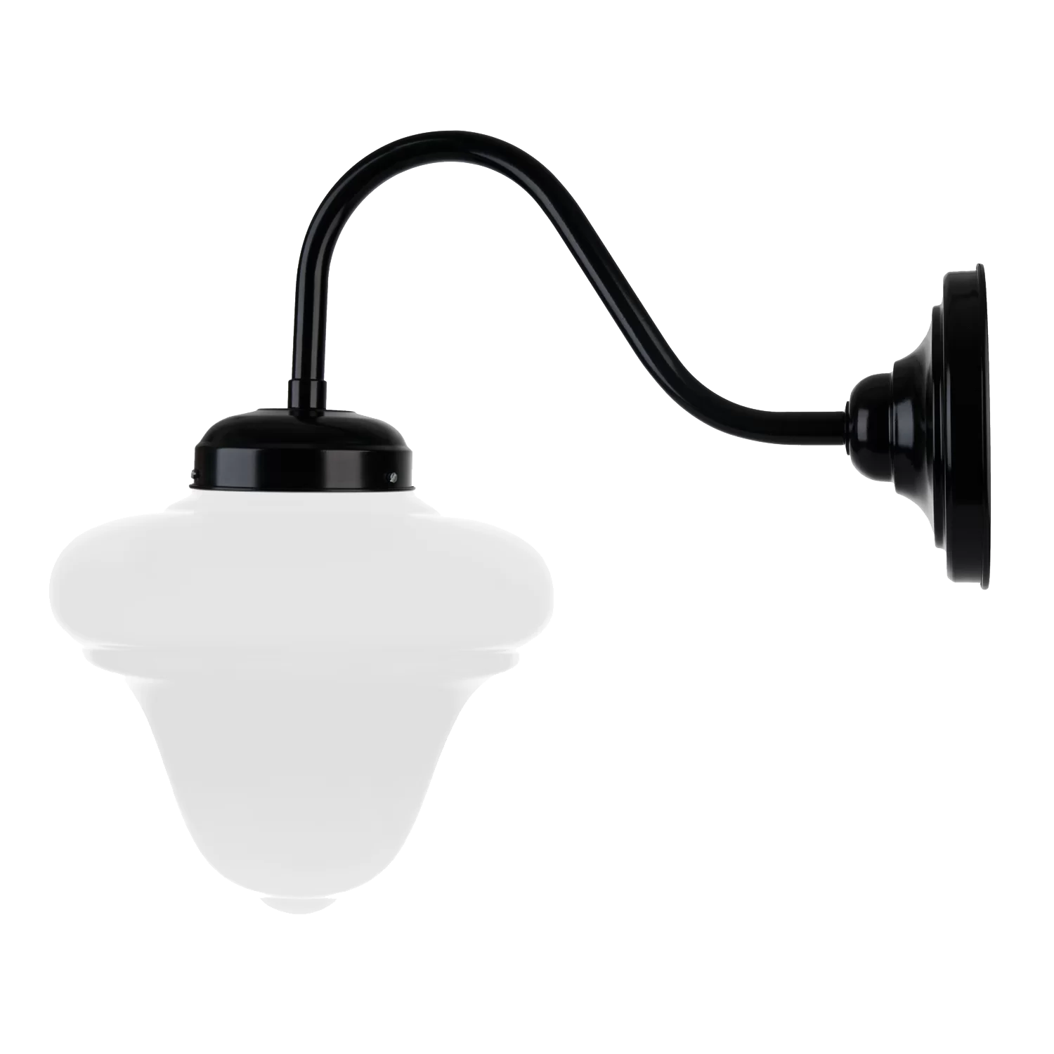 Aplique Delaware. Luz pared con brazo curvo y tulipa rosario opal, de acero. Terminación baño electrolítico laqueado y horneado. Portalámpara cerámico E27. Apto exterior