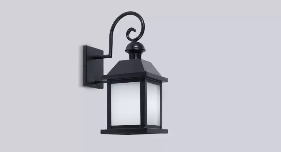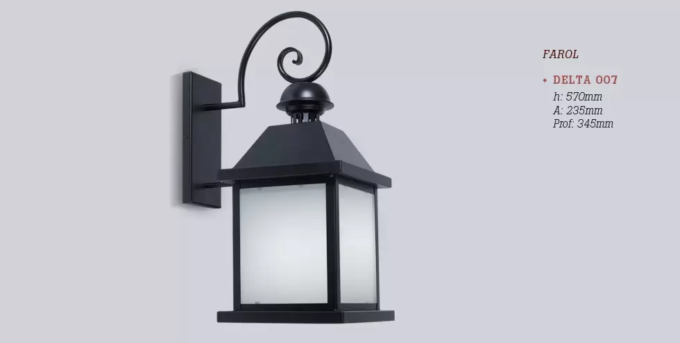 El aplique Delta es una lámpara tipo farol, de una luz, estilo moderno, disponible en color negro y dos tamaños: chico y grande.