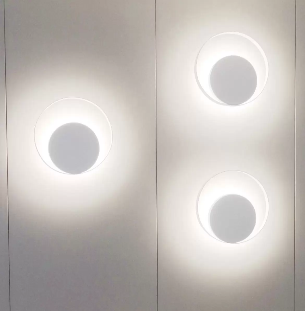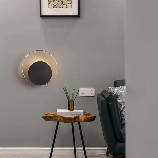 Aplique Eclipse es una luminaria de pared con base circular en blanco o negro con detalles en plátil, bronce o cobre.