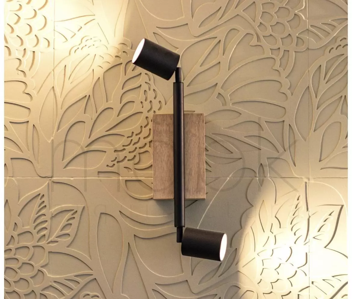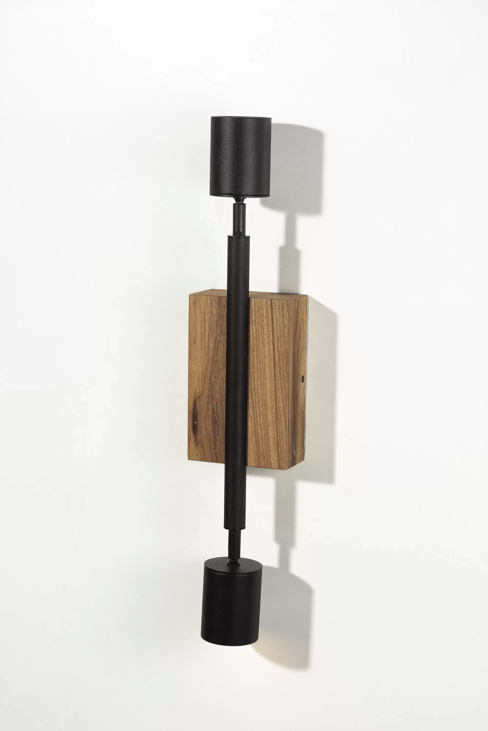 Aplique L doble es de una composición geométrica simple con predominio de lineas rectas que combina la calidez de la madera con la dureza de los cilindros de metálicos. Posee dos cabezales articulada que permite dirigir la luz en el espacio.