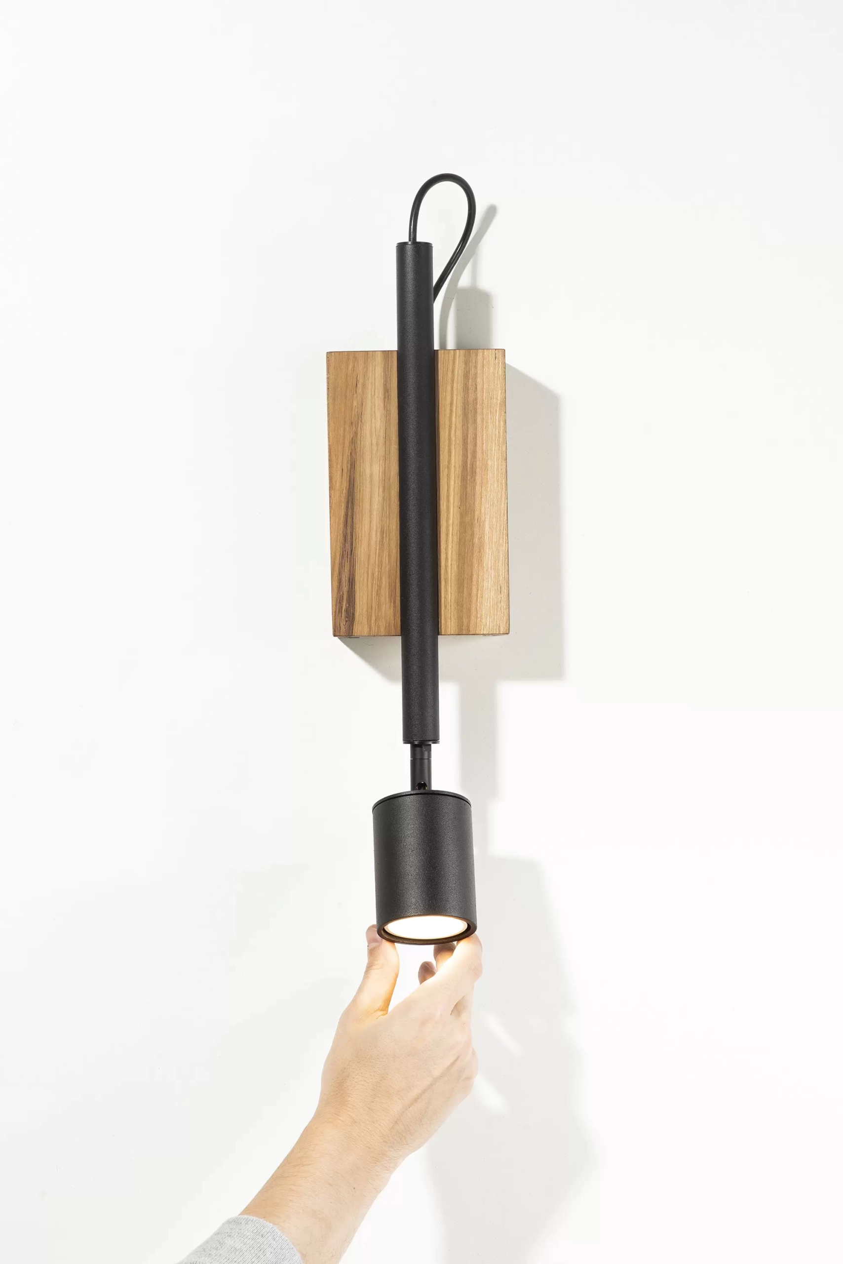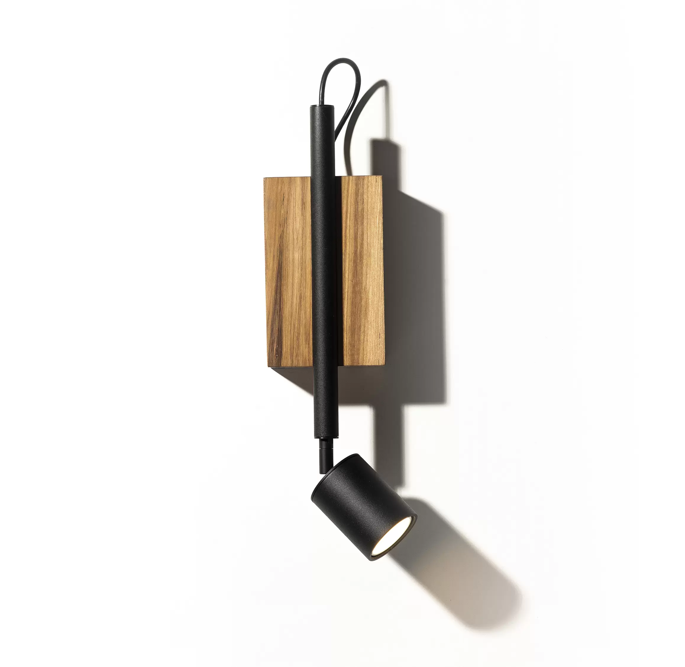 Aplique de pared compuesto por una caja de madera petiribi que sostiene un tubo con cabeza direccionable en su extremo inferior. Cable eléctrico blanco o negro. Opcional con perilla dimmer (apto LED) en caja de madera.