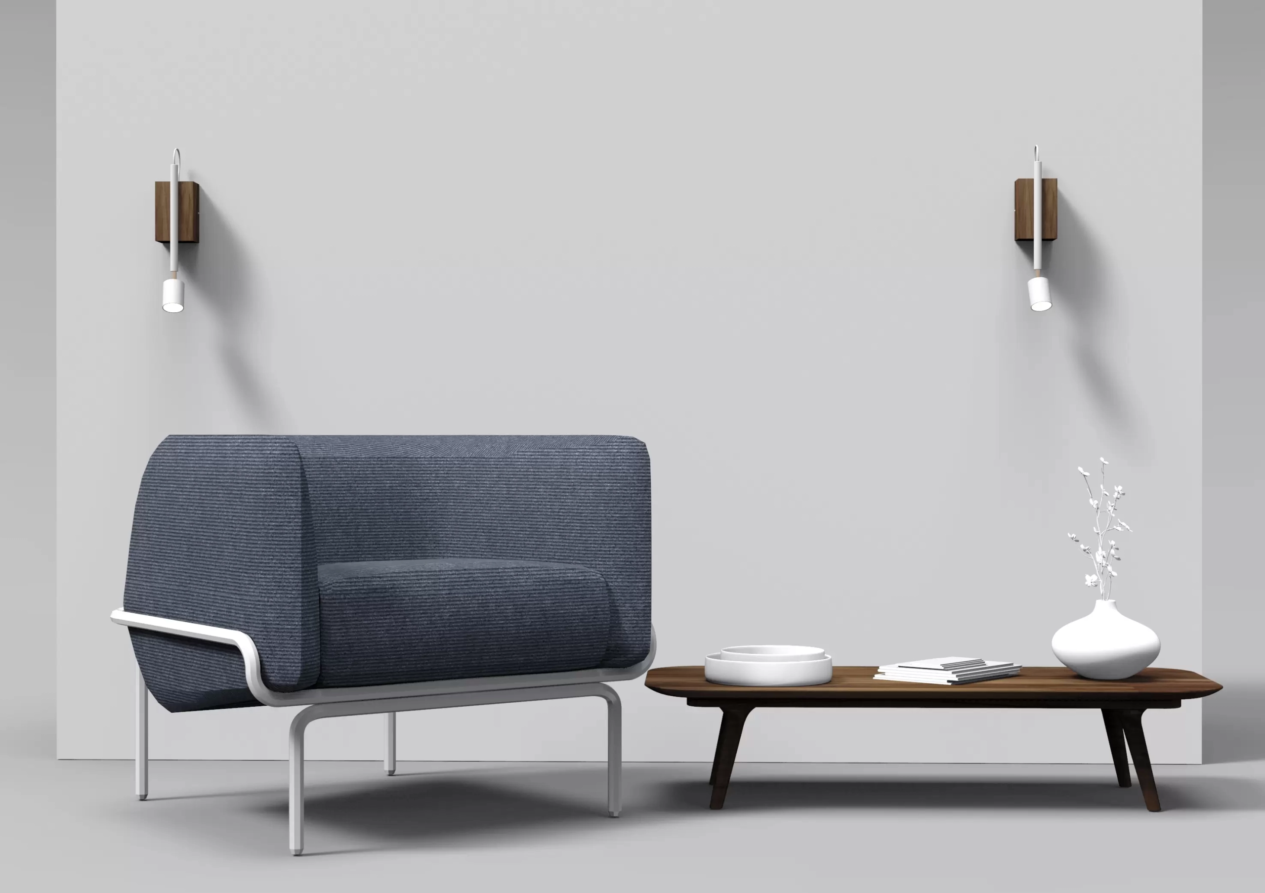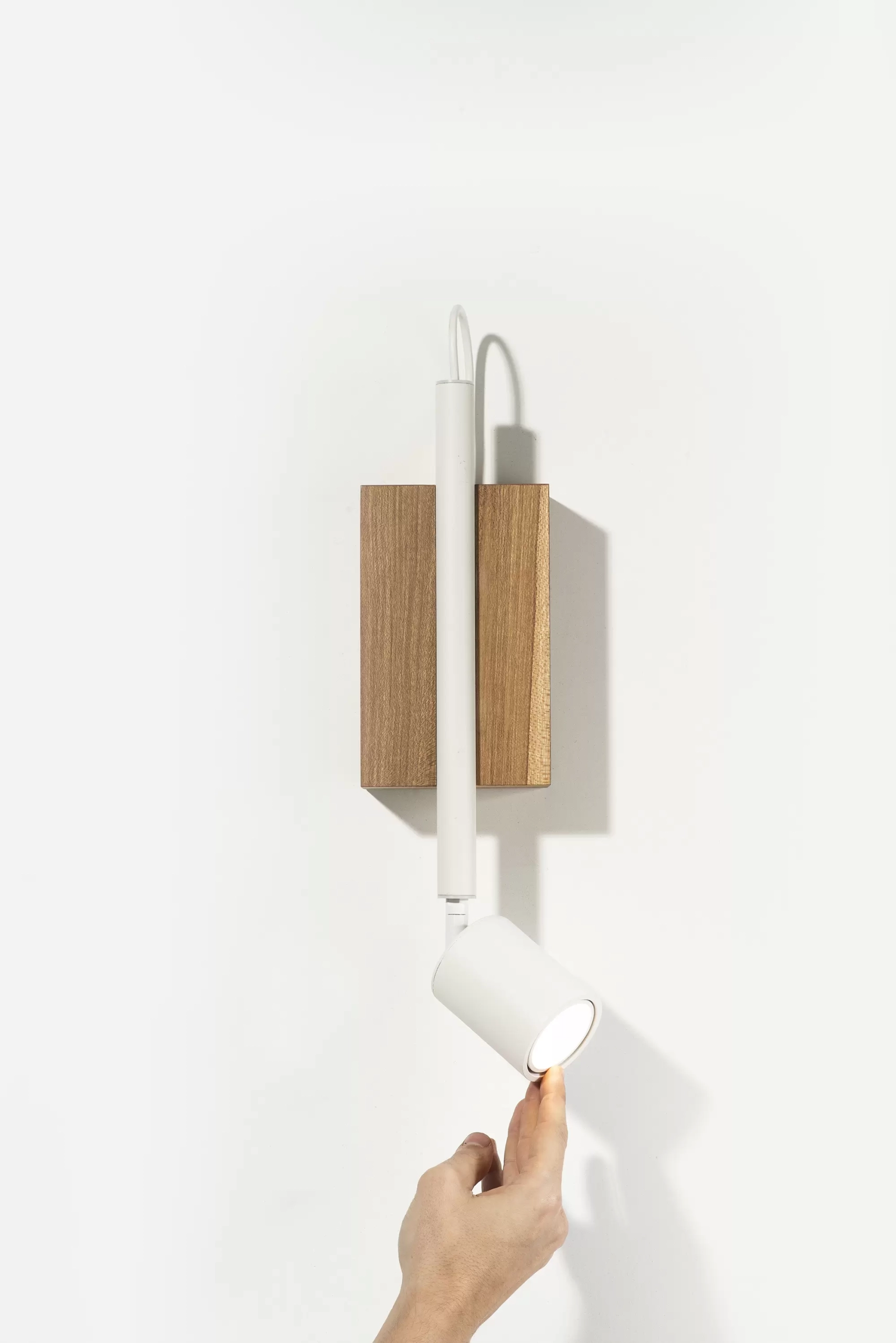 Aplique L simple es una composición geométrica simple con predominio de lineas rectas que combina la calidez de la madera con la dureza de los cilindros de metálicos. Posee una cabeza articulada que permite dirigir la luz en el espacio.