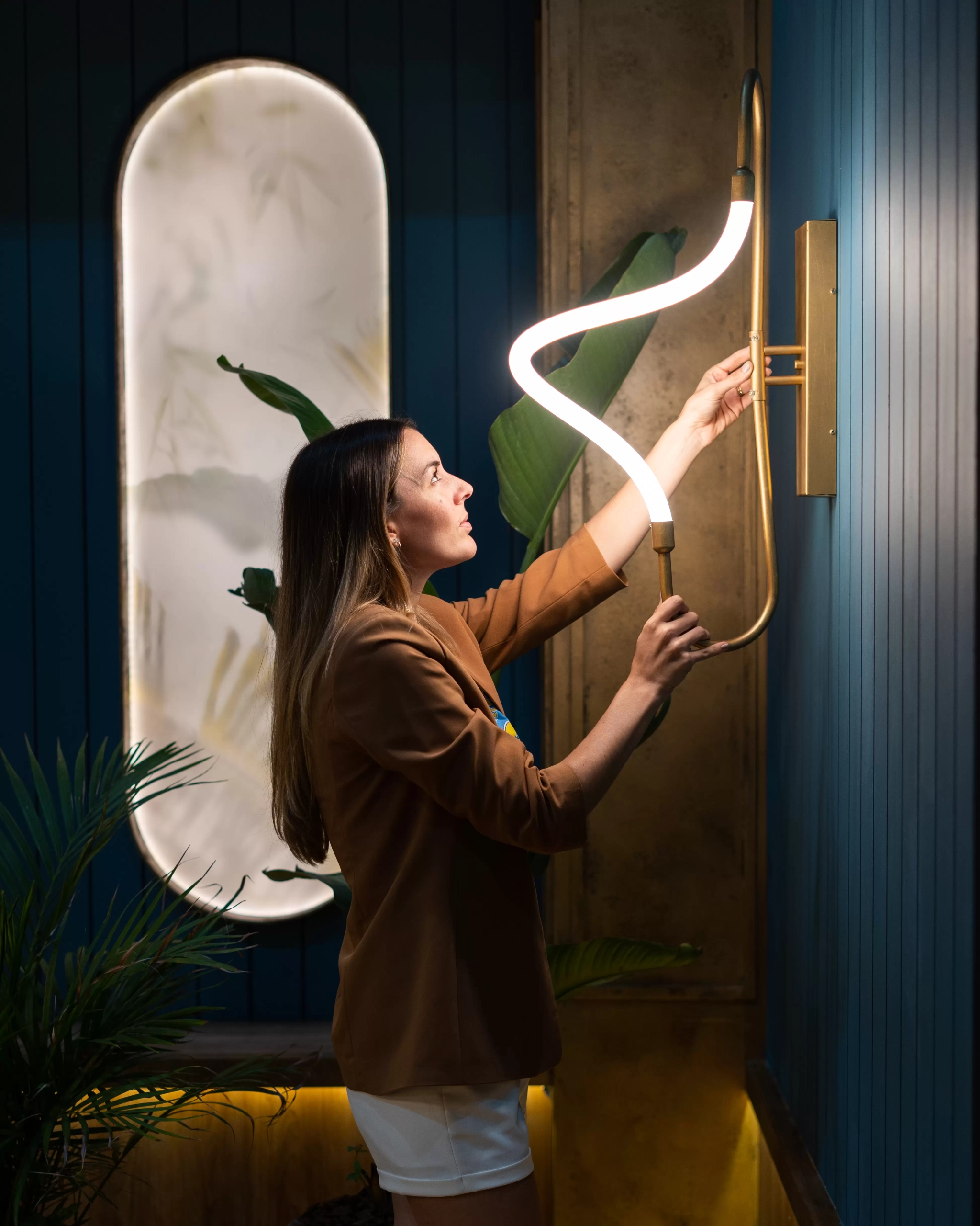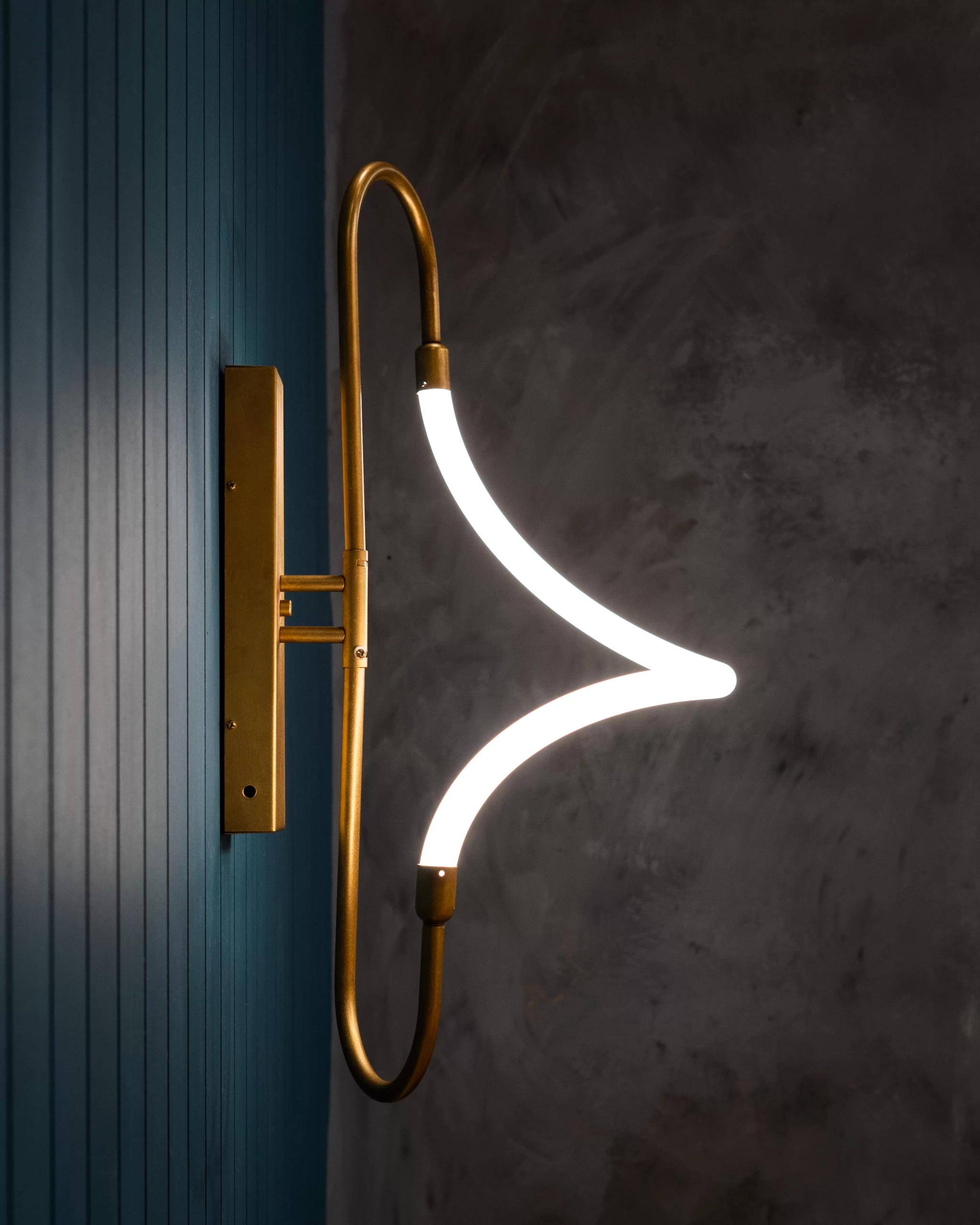 Aplique Organic Curvo. Luminaria moderna fabricada en metal, con tira LED integrada y fuente switching dimmerizable. Disponible en blanco, negro o bronce.