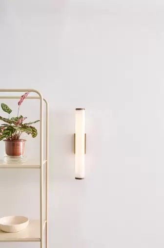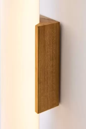 Aplique Riela es una lámpara de pared lineal, fabricado en acrílico transparente opal y madera de petiribí en los extremos.