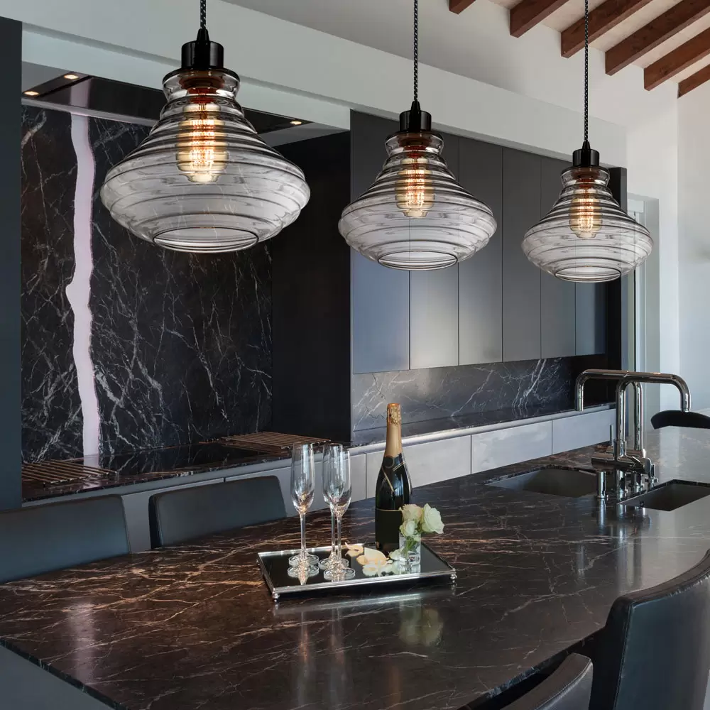 Lámpara colgante de cristal fume espejado o transparente apto LED. Disponible de forma individual, doble o triple.