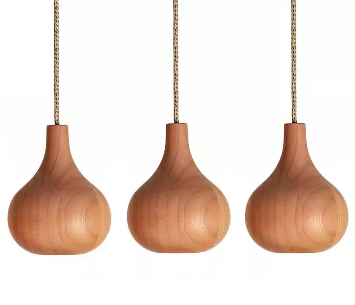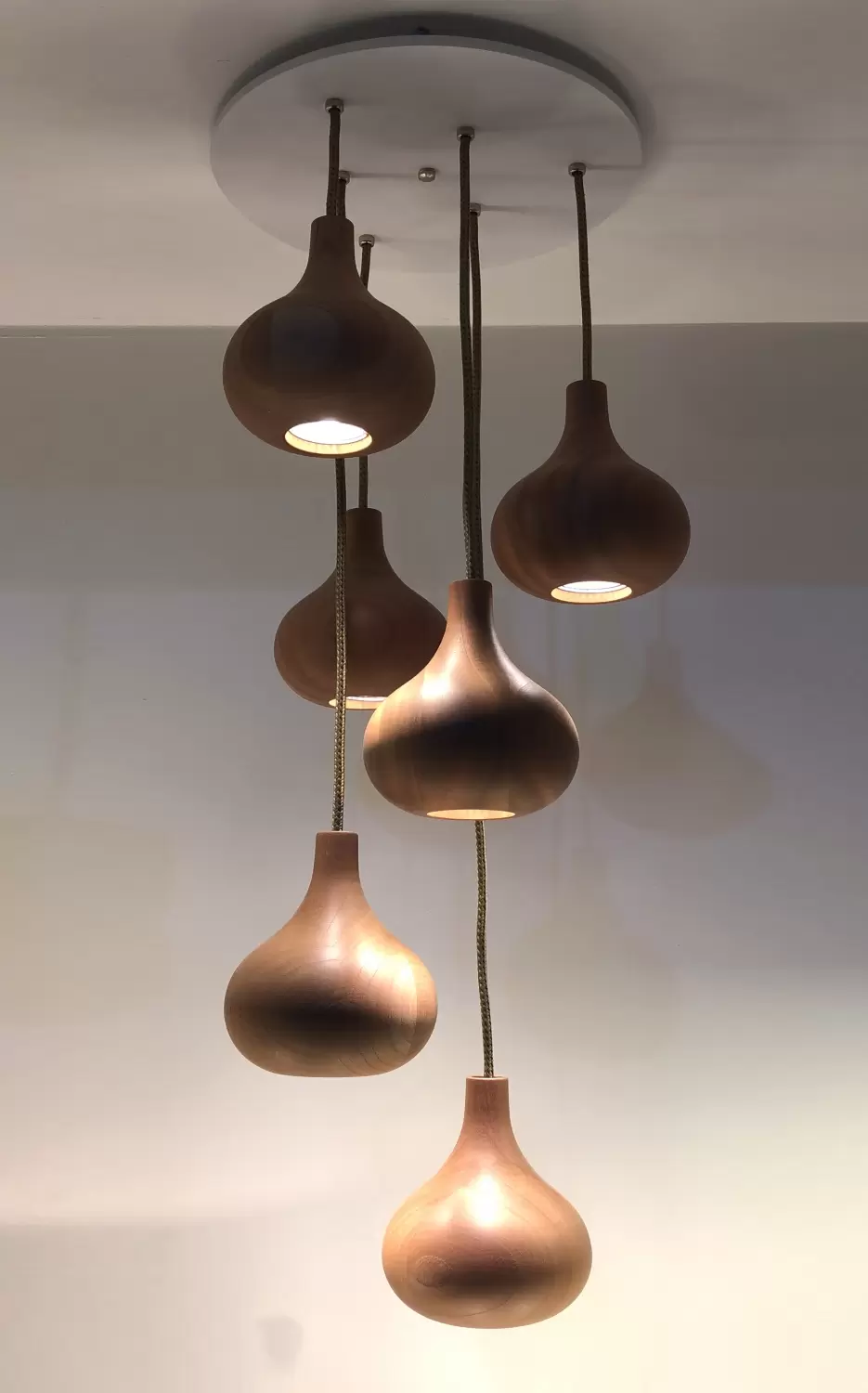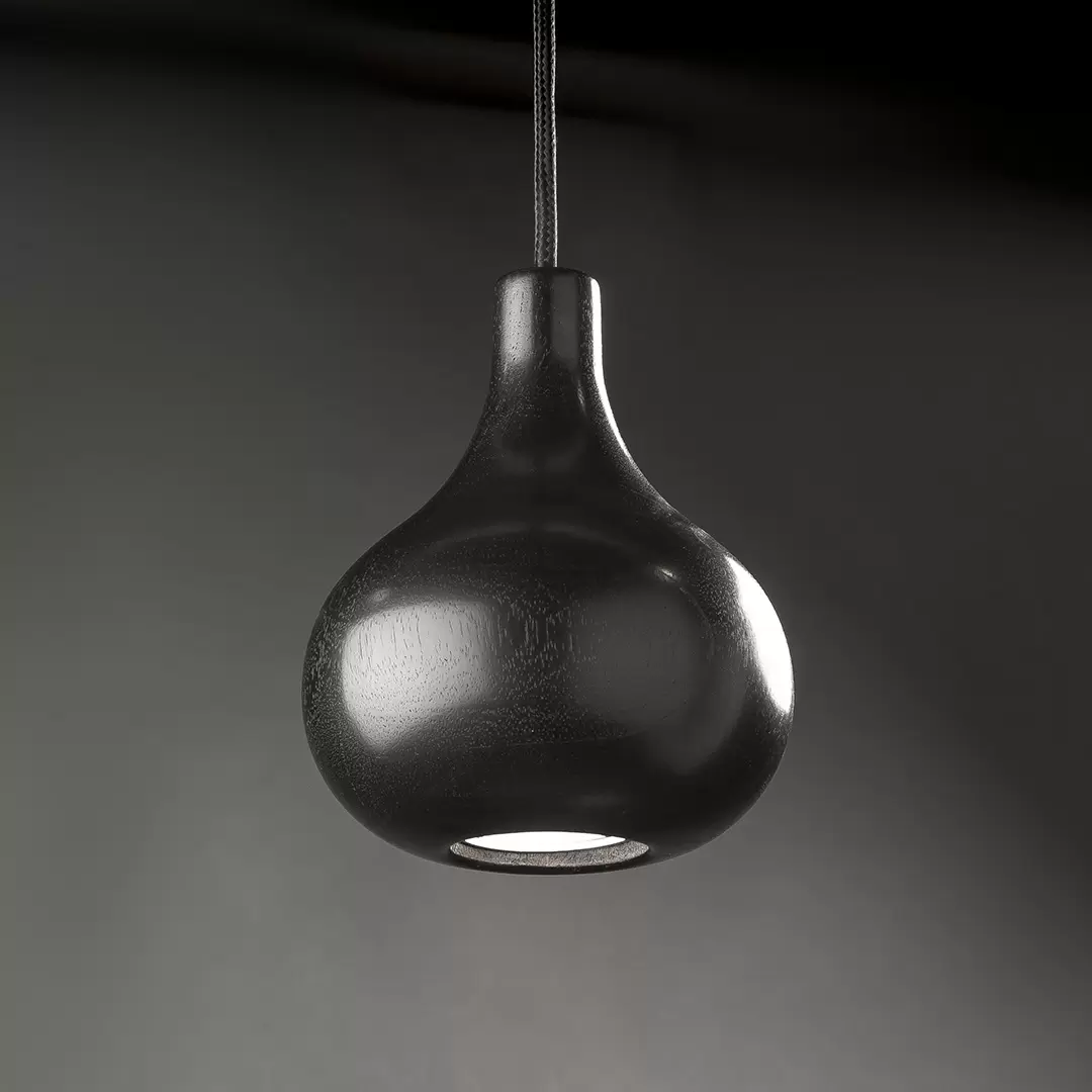 Lámpara colgante con forma uniforme de luz directa apto LED. Cabezal de madera torneada a mano.