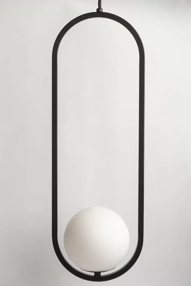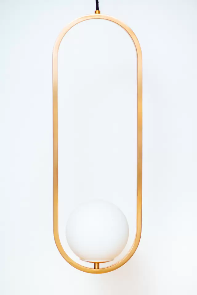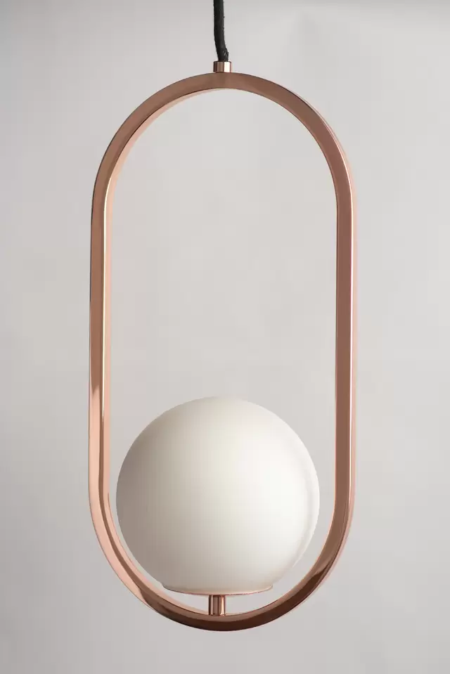 Colgante Aro. Luminaria de estructura fabricada íntegramente en metal y bocha de luz fabricada en vidrio de estilo moderno. Disponible en 2 tamaños (small-large) y 5 colores: blanco, negro, cobre, bronce y plátil.