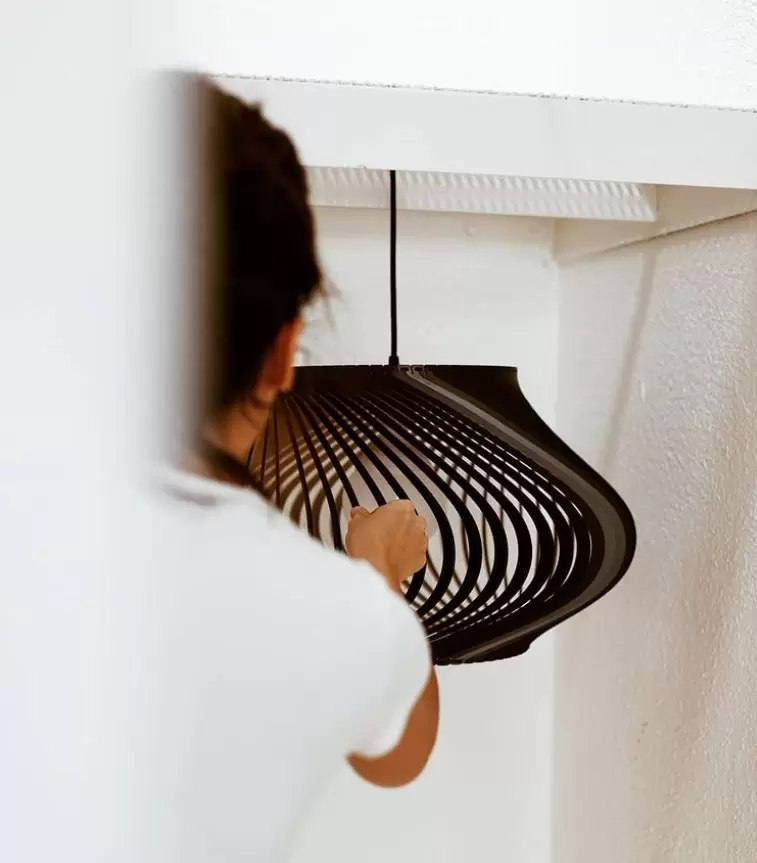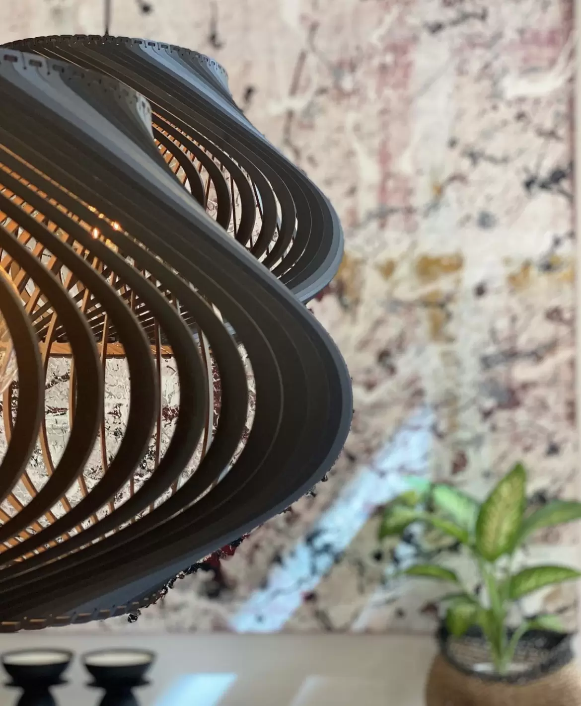 Colgante Barcelona es una lámpara realizada en finas hebras de madera de forma artesanal disponible en tres colores: blanco, negro o gris. Recomendamos esta luminaria para ambientes de estilo nórdico.