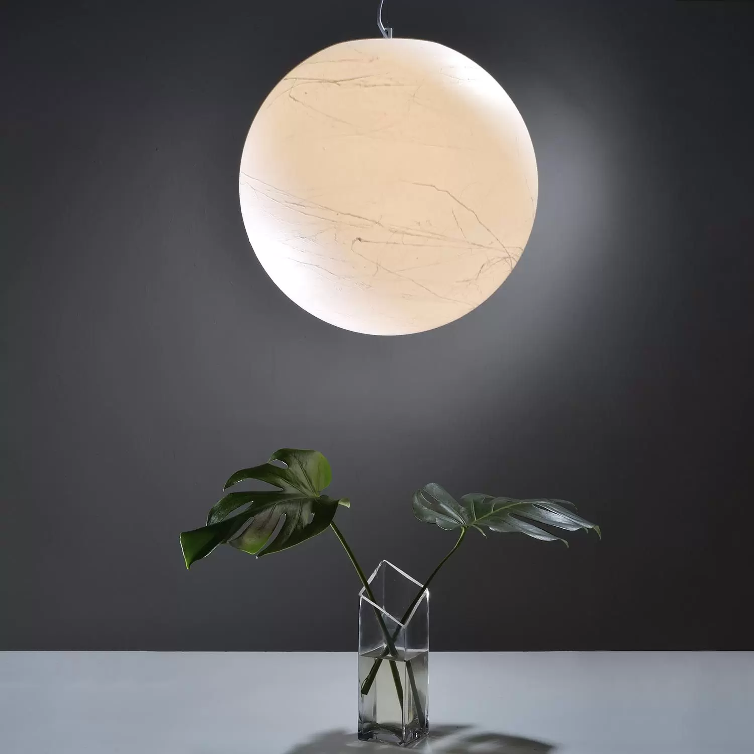 Colgante Bulan es una luminaria de suspensión con forma esférica decorativa que nos regala una luna llena, que ilumina el ambiente con elegancia. Se destaca por su diseño simple, preciso y fino que armoniza perfectamente con espacios que necesitan calidez y armonía. Fabricada con materiales de alta calidad, garantiza durabilidad y un rendimiento lumínico excepcional.
