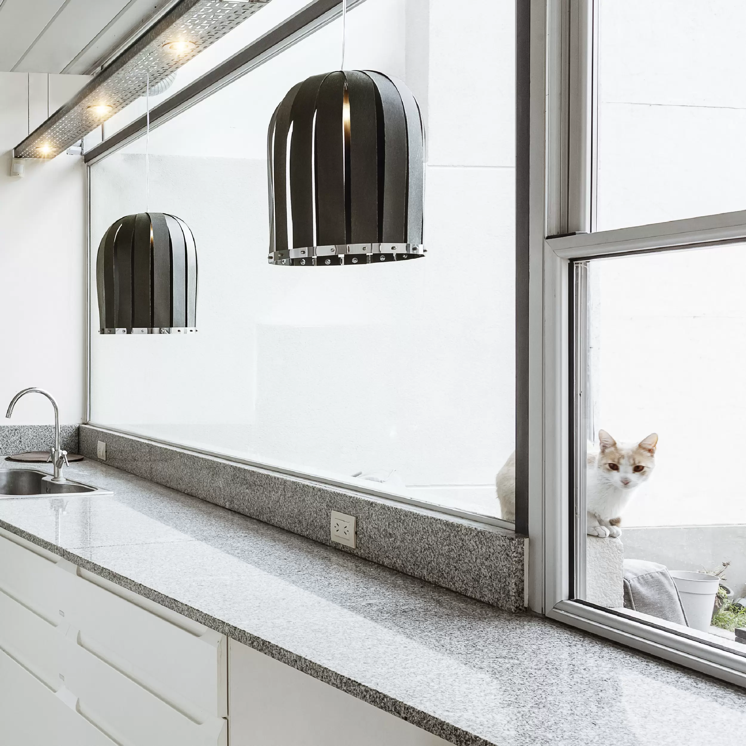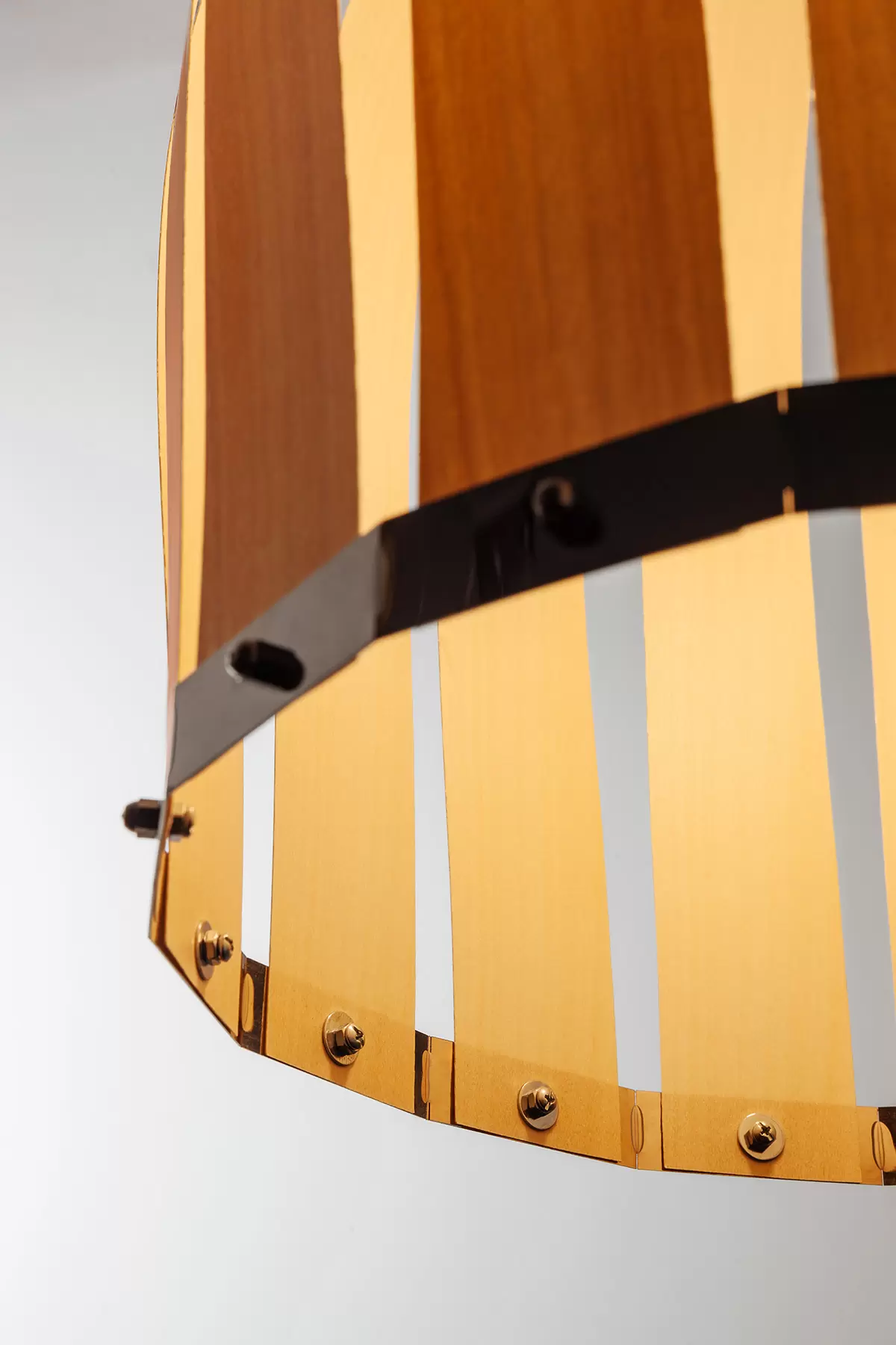 Colgante Cages. Este modelo de lámpara combina celdas de madera con un aro hexadecagonal de acero inoxidable. Esto resulta en una interesante estructura que enjaula a la fuente de luz.