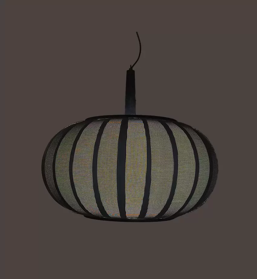 Colgante Calabán. Lámpara colgante confeccionada artesanalmente. Estructura metálica cubierta de gajos de tela arpillera o tela voile.