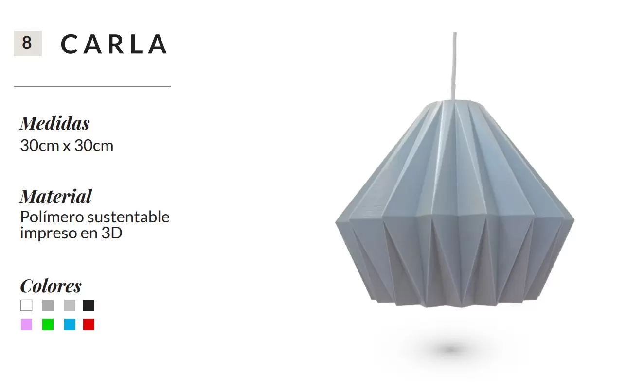 El Colgante Carla es una lámpara fabricada en impresión 3D de estilo moderno, disponible en varios tamaños y colores. Clara viene disponible en blanco, negro, gris claro, gris oscuro y beige en todos sus tamaños. A su vez, las lámparas de hasta 40 cm, también están disponibles en colores tales como rosa, azul, rojo, verde u otros. Consultar por los mismos.