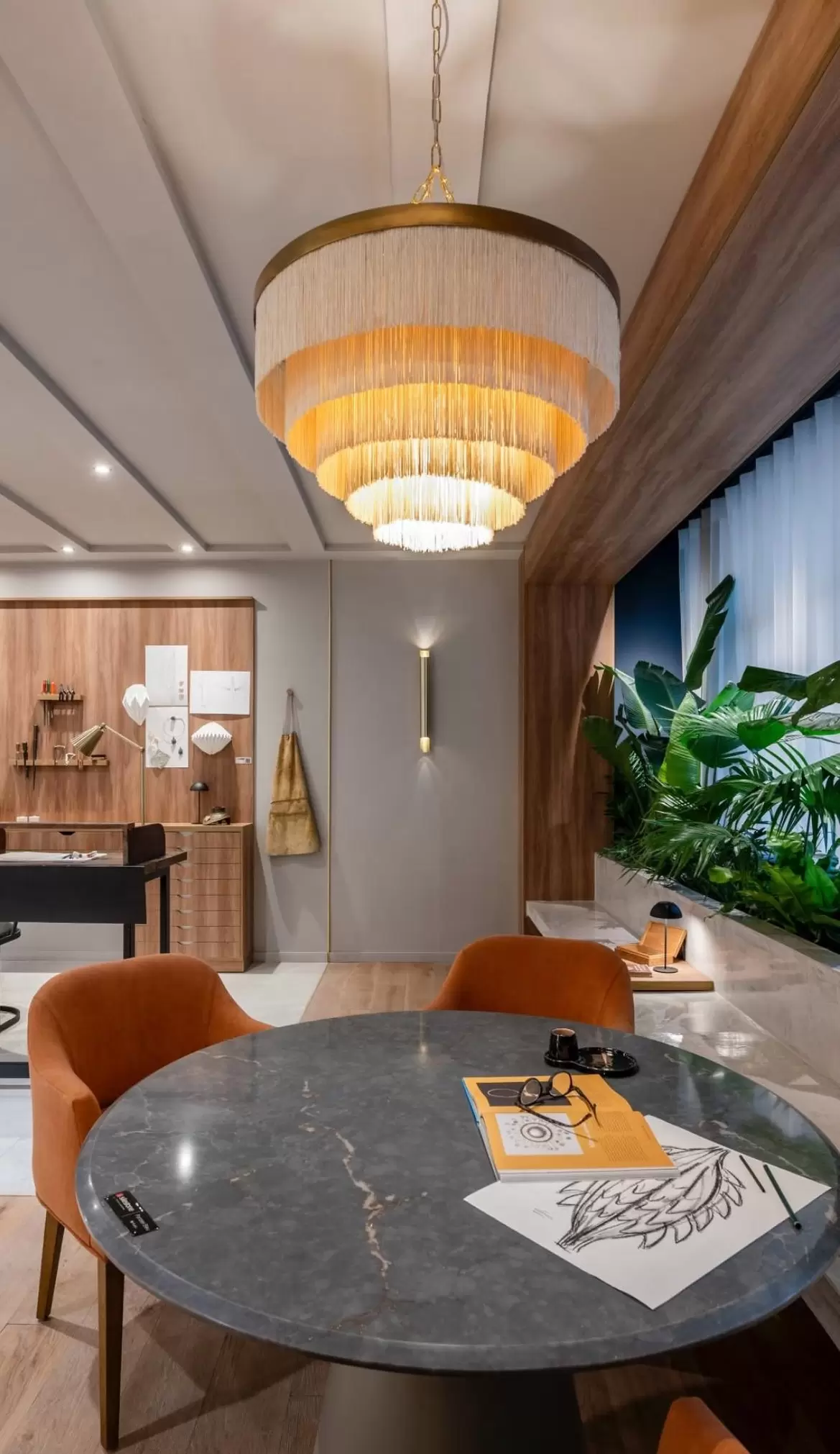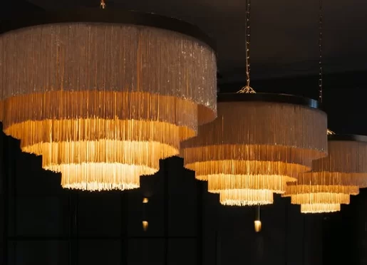 Colgante Charleston es una luminaria con estructura metálica 60cm diámetro de la cual cuelgan un sin fin de hilos de seda.