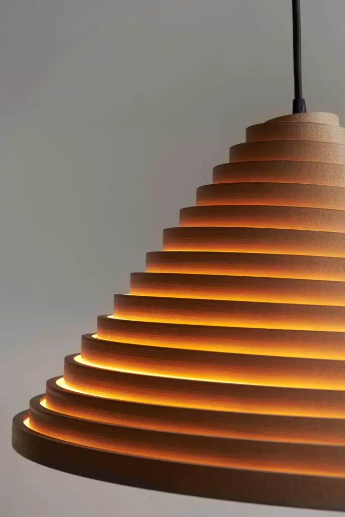 Colgante Espinel es una lámpara realizada que parte de una placa de MDF de 18mm conformando un espiral continuo. Ideal para colocar sobre una mesa.