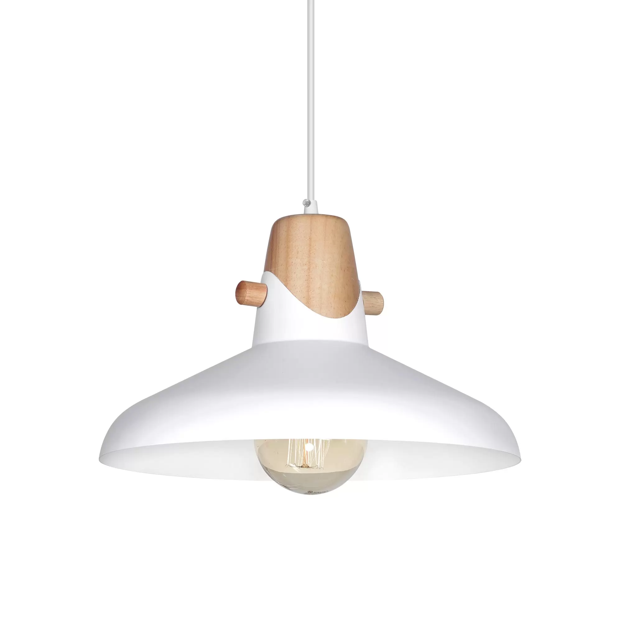 Colgante Estocolmo 2. Luminaria de estilo moderno, fabricada en aluminio y madera y arquitectura de campana. Disponible únicamente en color blanco.