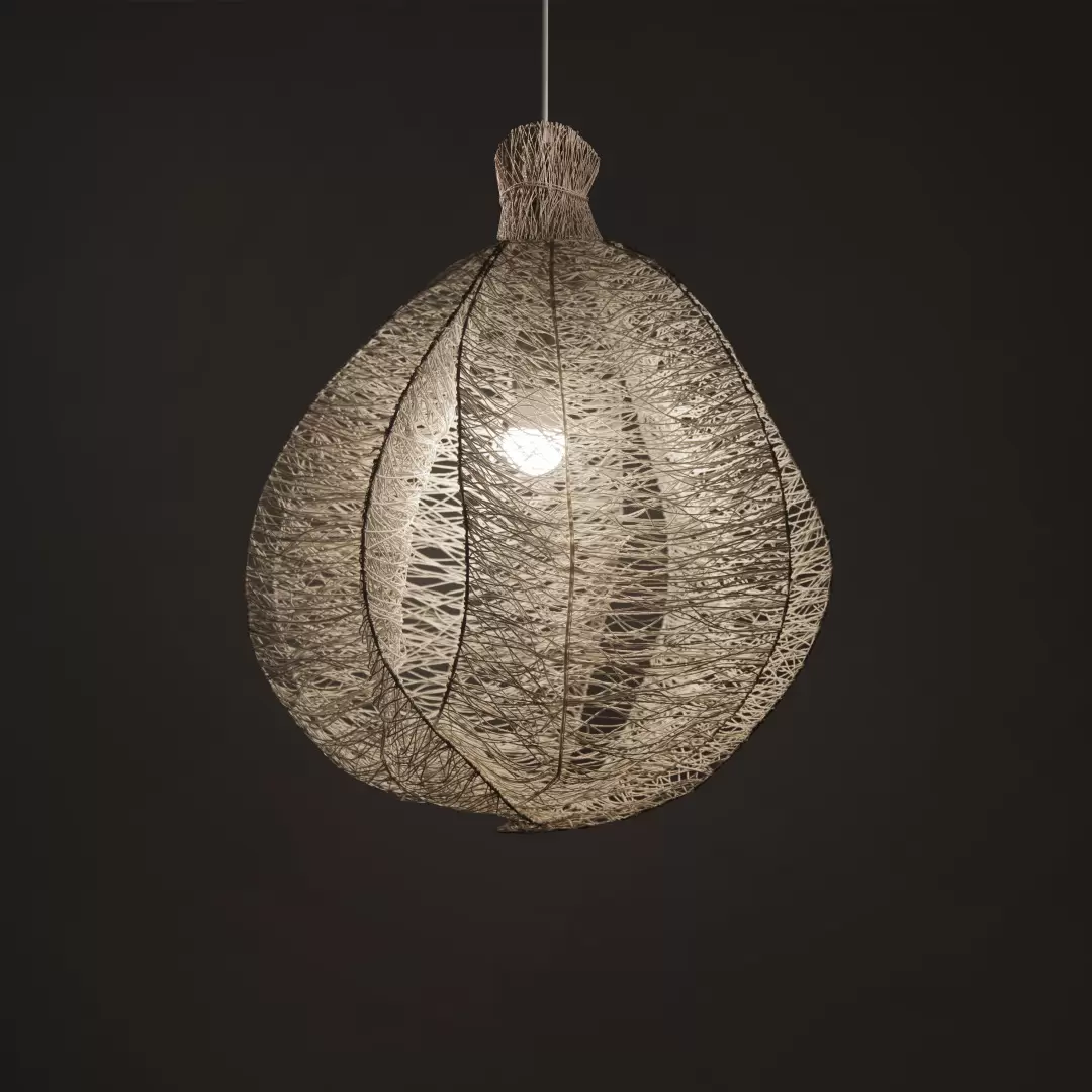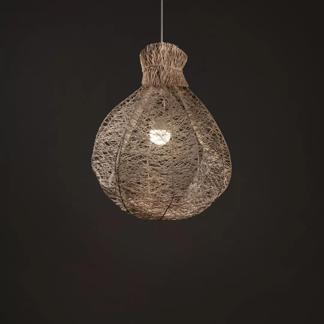 Colgante Exótica. Exótica es una lámpara completamente artesanal hecha de fibra de algodón resinada con cono de madera Guatambú. Vine en tres tamaños S, M y L.