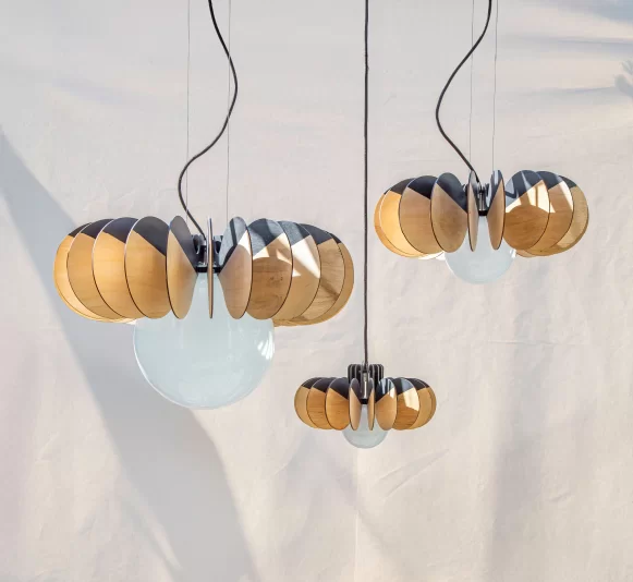 Colgante Flora Madera. Luminaria es una luminaria constituida en madera laminada de estilo moderno, compuesta por 18 o 24 pétalos dependiendo su tamaño.