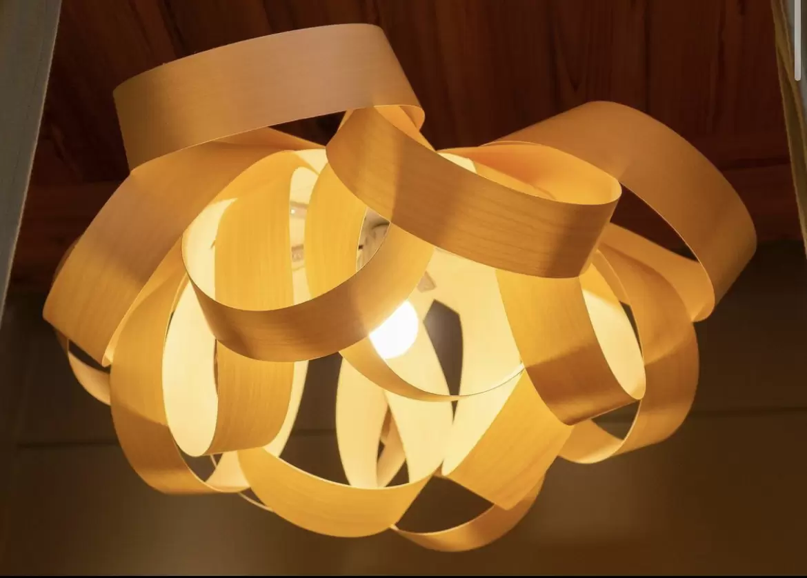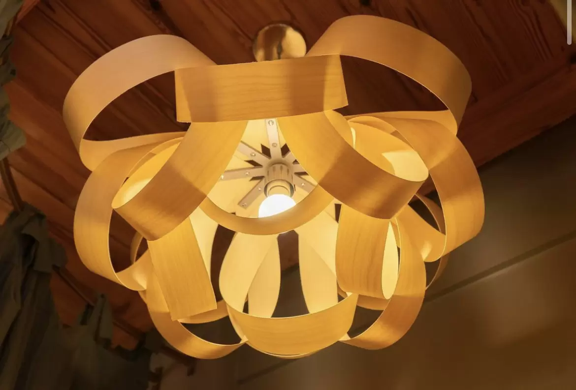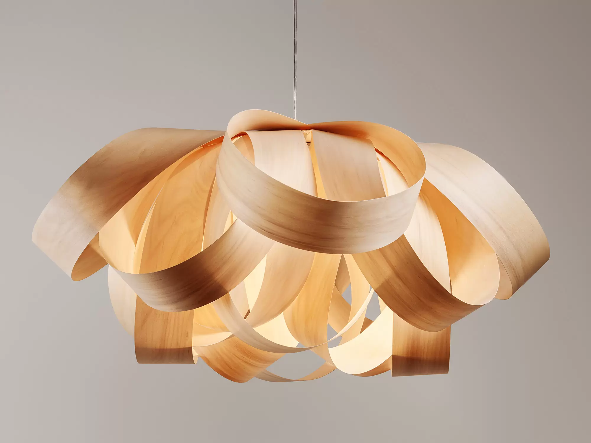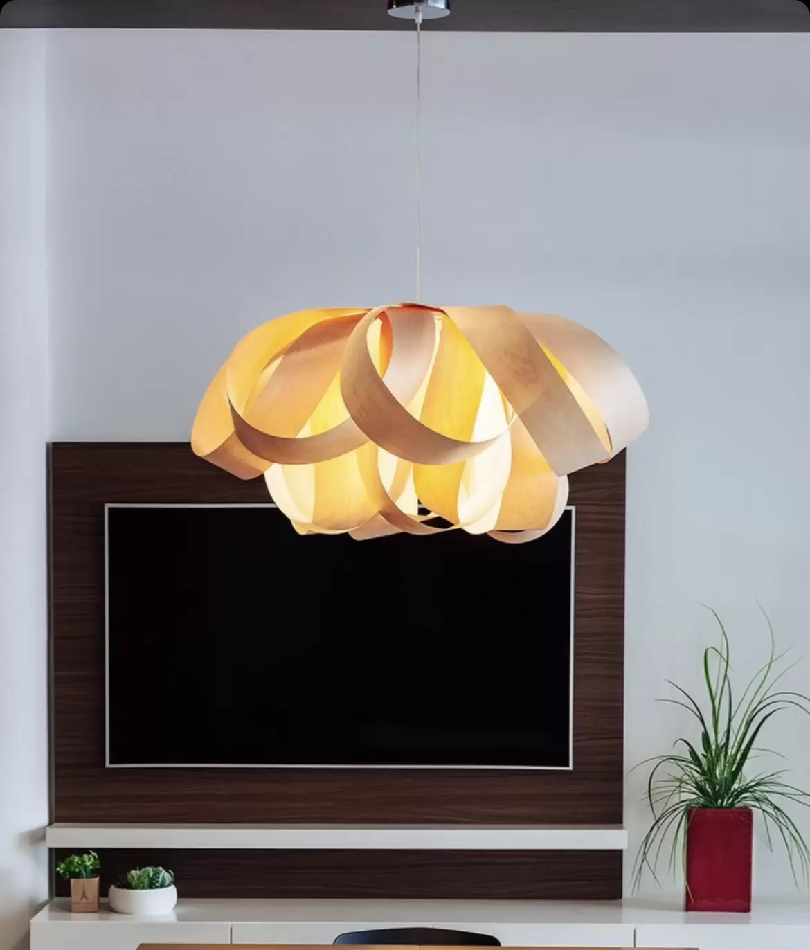 Colgante Gross. En esta lámpara, su corazón es una estrella central que sujeta a toda la estructura. Pese a su importancia, el protagonismo del modelo es tomado por las múltiples chapas de madera que conforman un diseño majestuoso y de gran volumen.