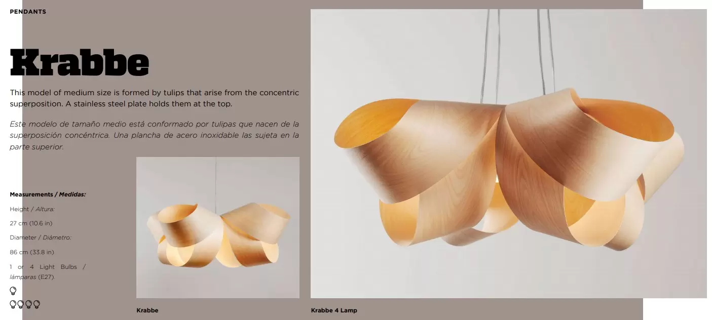 Colgante Krabbe. Este modelo de tamaño medio está conformado por tulipas que nacen de la superposición concéntrica. Una plancha de acero inoxidable las sujeta en la parte superior.