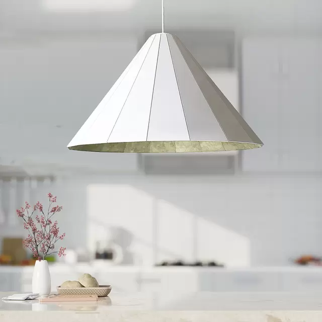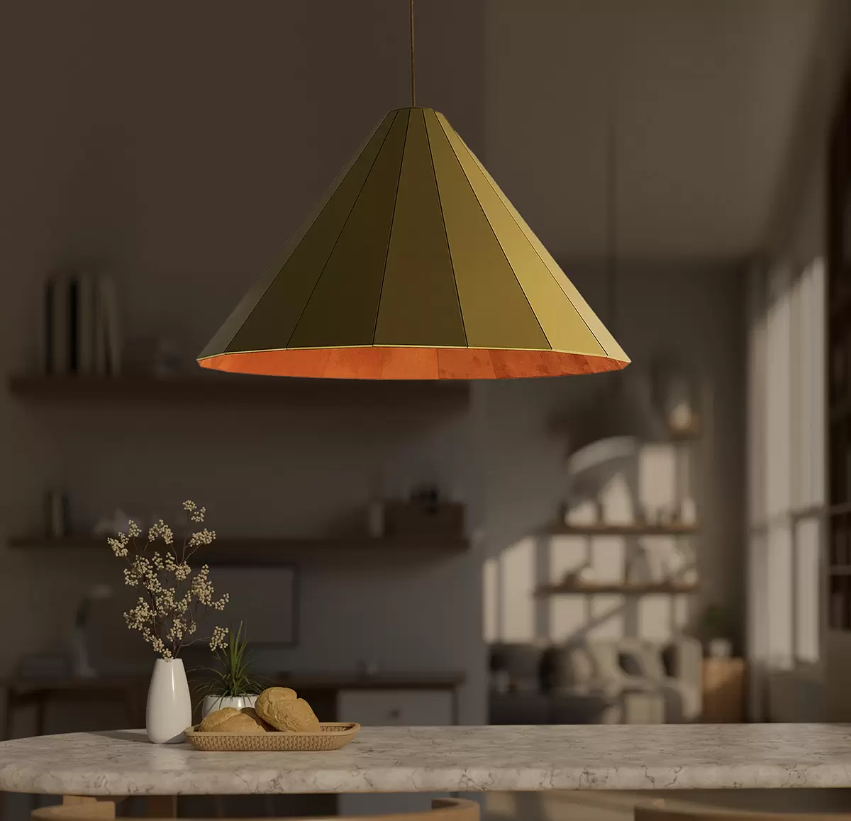 Colgante Maja. Luminaria de diseño plegable realizada en placas laqueadas, de estilo moderno. Disponible en color mostaza, blanco y negro.