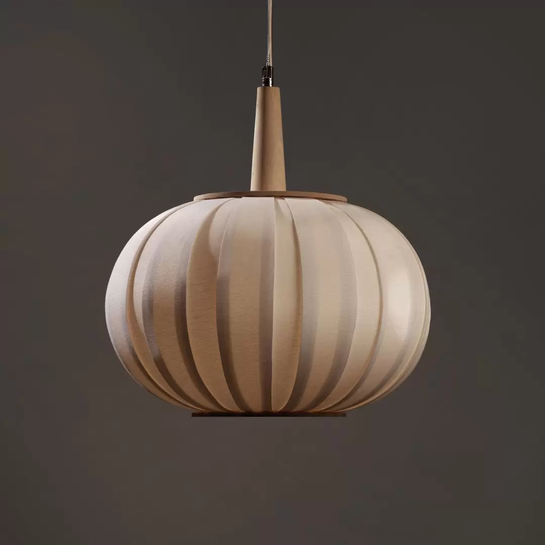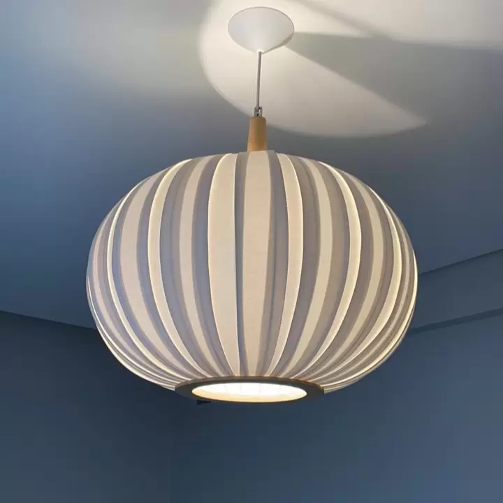 Colgante Mandarina Blanca. Lampara confeccionada artesanalmente. Estructura metálica forrada con doble capa de tela Voile o arpillera y Polipropileno.
