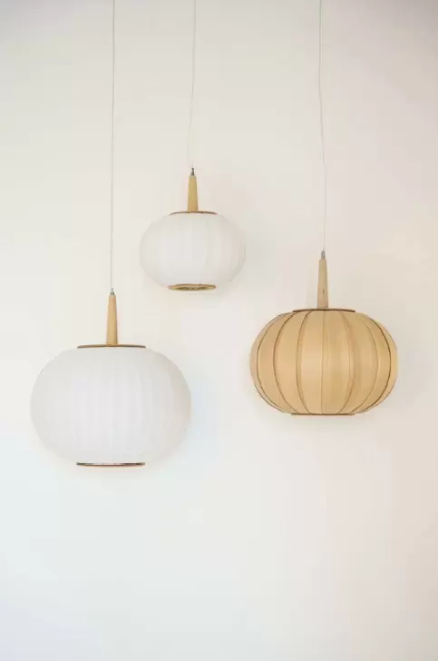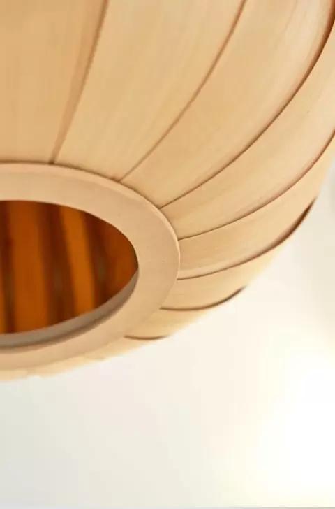 Colgante Mandarina Madera. Lampara confeccionada artesanalmente. Es una estructura metálica cubierta de gajos de madera Guatambú. Disponible en 6 tamaños.