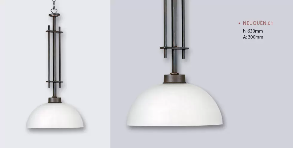 El colgante Neuquén es una lámpara de una luz, estilo clásico, disponible en color cobre patinado. Adaptable a todo tipo de ambiente.