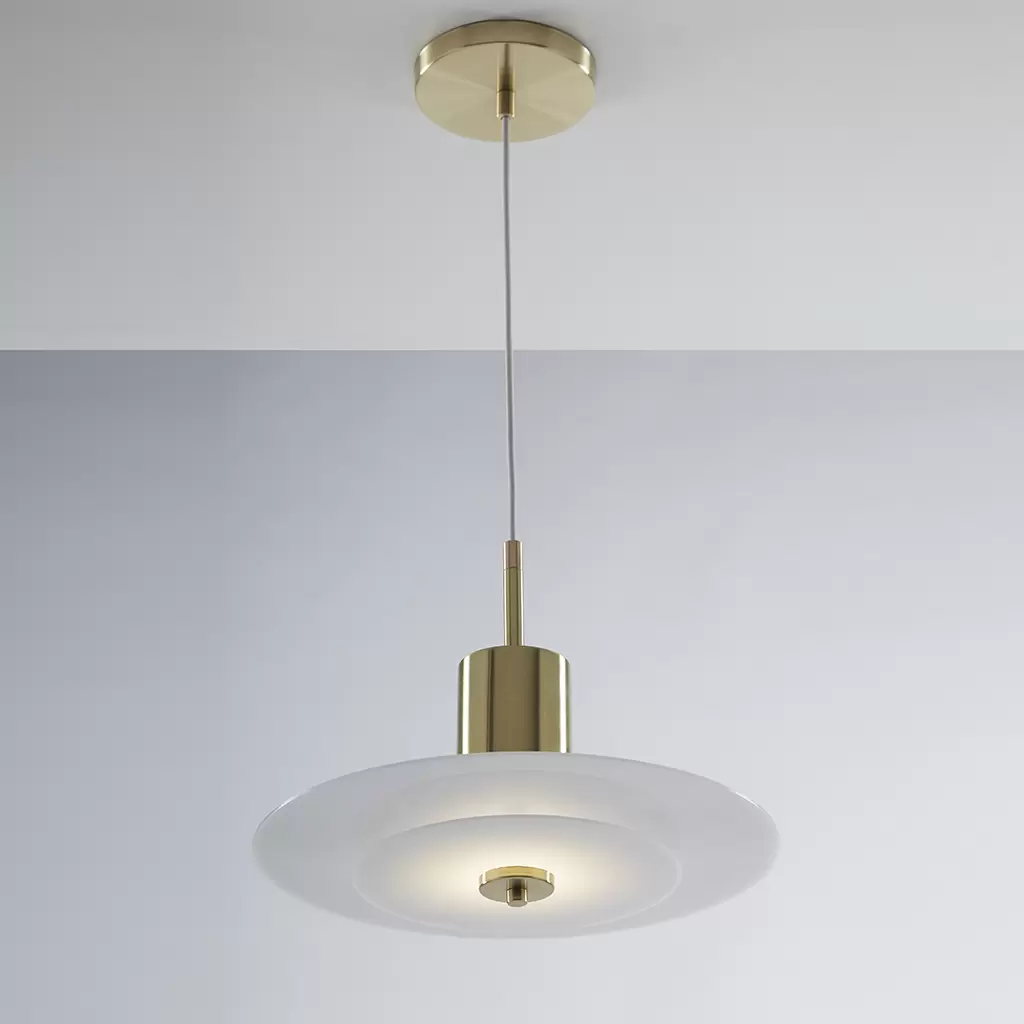 Colgante Orbit. Luminaria de techo fabricada en acrílico y hierro, de estilo moderno, con LED integrado y disponible en dos colores: bronce y plátil.