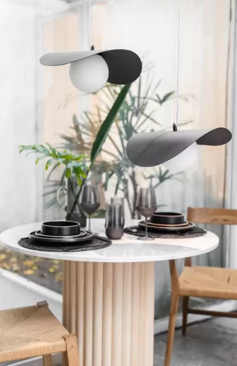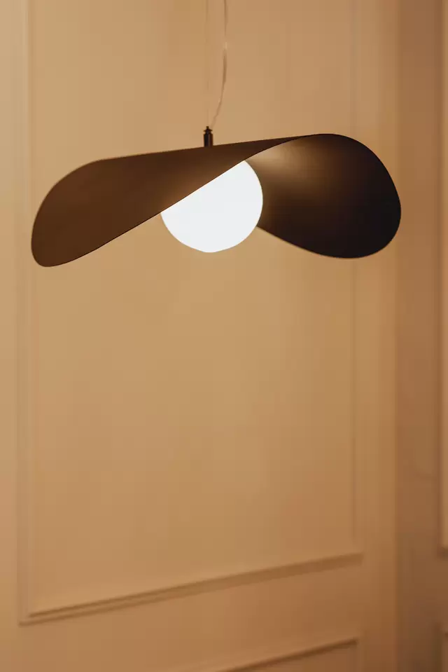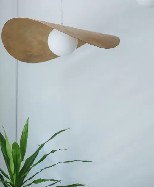 Colgante Oro. Luminaria colgante de estilo moderno, fabricada en metal y de arquitectura innovadora. Pintada en oro en polvo. Disponible en 3 tamaños: S, M y L y 3 colores: dorado, negro o blanco.