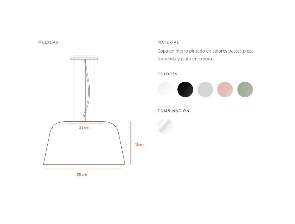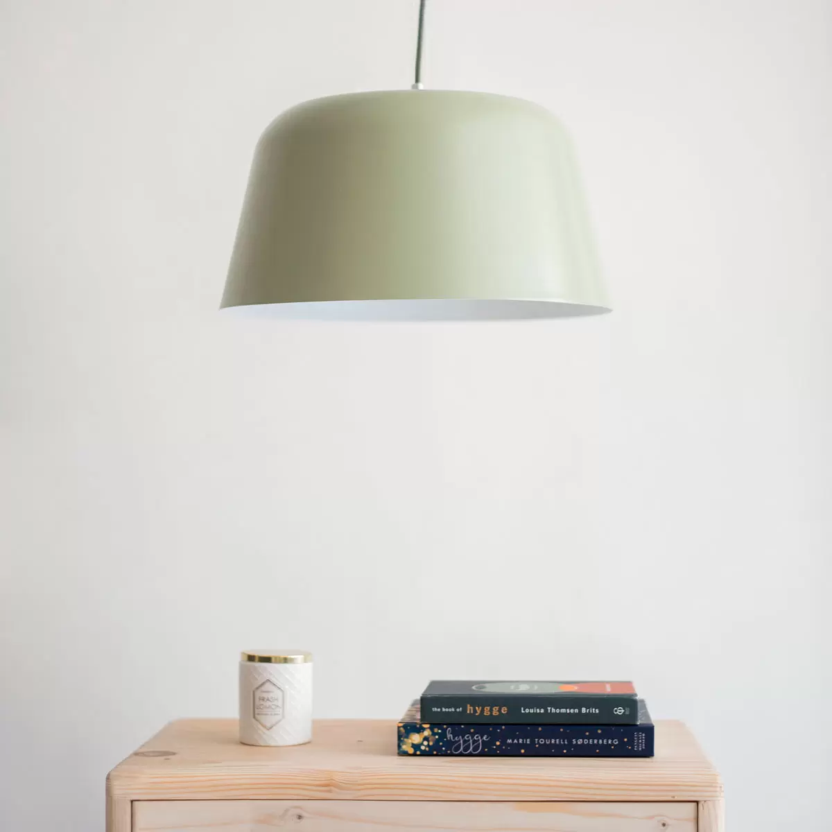 Colgante Oslo es una lampara estilo campana de 36cm de diámetro disponible en varios colores como gris, negro, blanco, salmón u oliva.