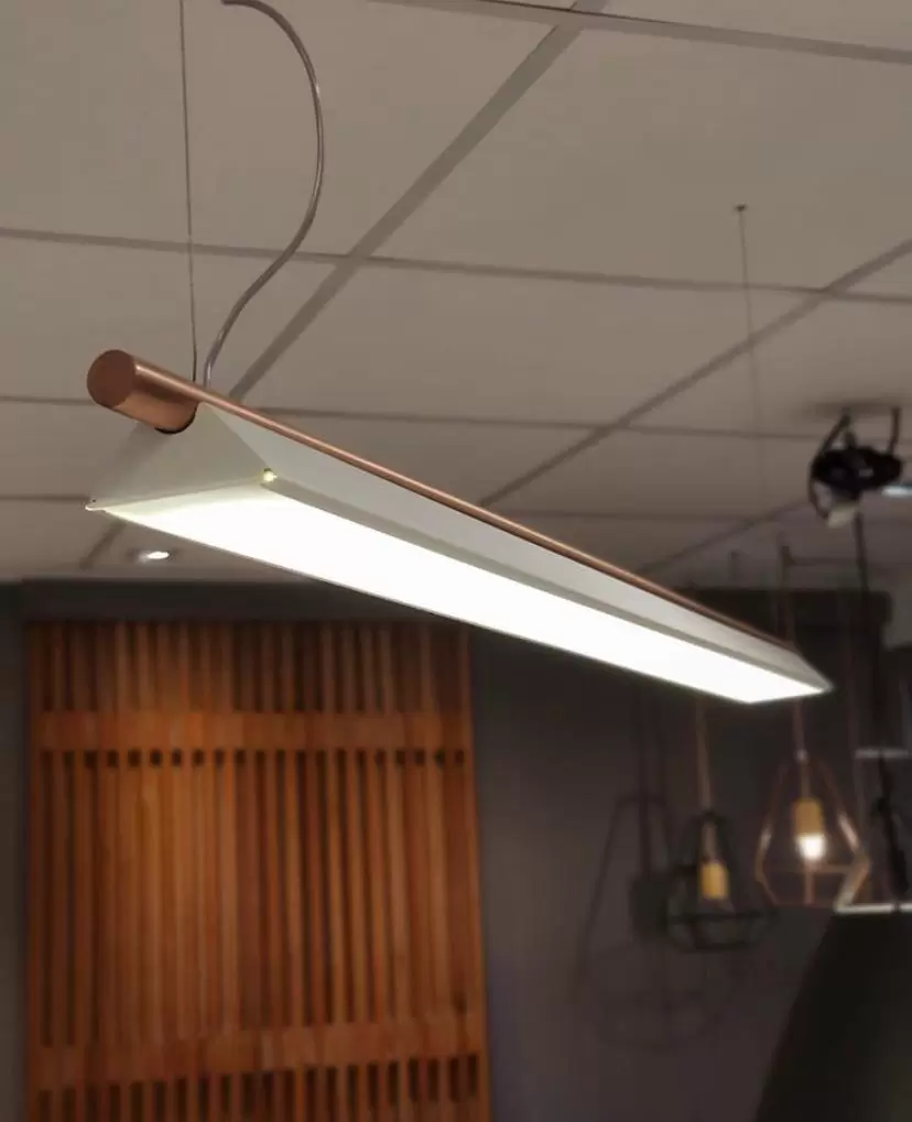 Colgante Parma es una lámpara lineal de 36w con pantalla de hierro plegada pintada en color blanco o negro con detalles en platil, bronce o cobre.