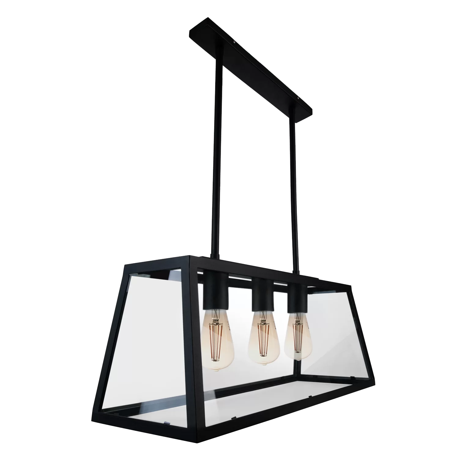 Colgante Pensilvania Triple. Farol triple, cuádruple o quíntuple en planchuela de hierro con vidrio transparente, barrales de 50 cm de largo. Portalámpara E27.