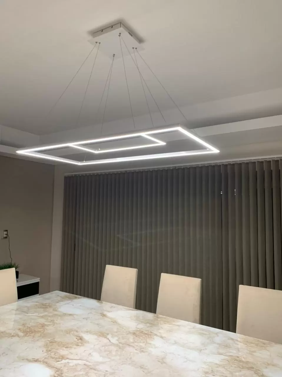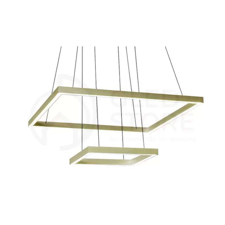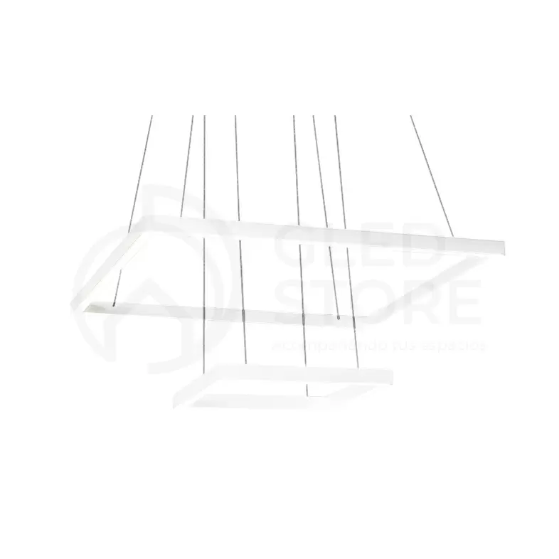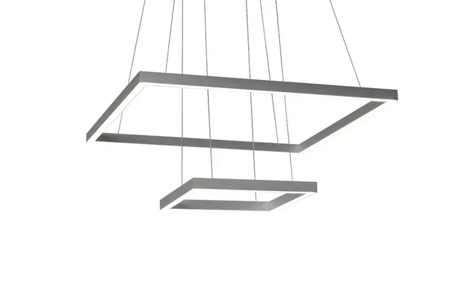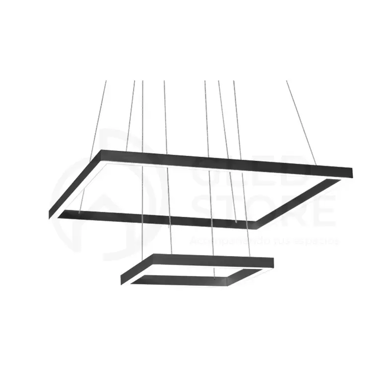 Colgante Quadra cuadrado doble es una lámpara ultra delgada de aluminio que ilumina desde su interior. Lámpara super personalizable respecto a color de led, largo de tensores, dimerización y color del artefacto.
