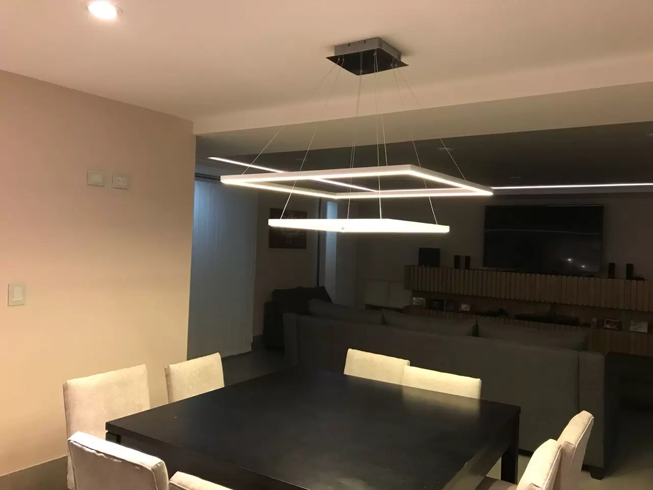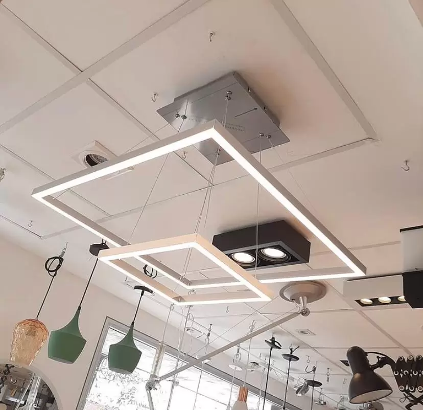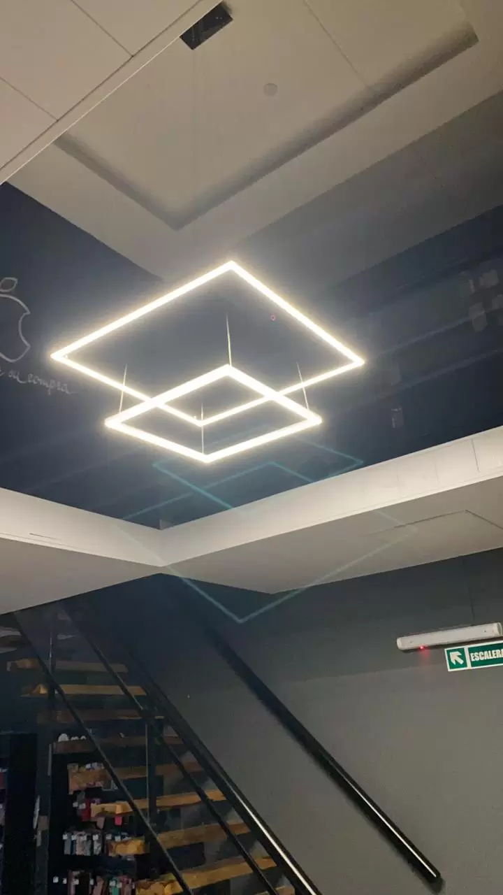 Colgante Quadra cuadrado doble es una lámpara ultra delgada de aluminio que ilumina desde su interior. Lámpara super personalizable respecto a color de led, largo de tensores, dimerización y color del artefacto.