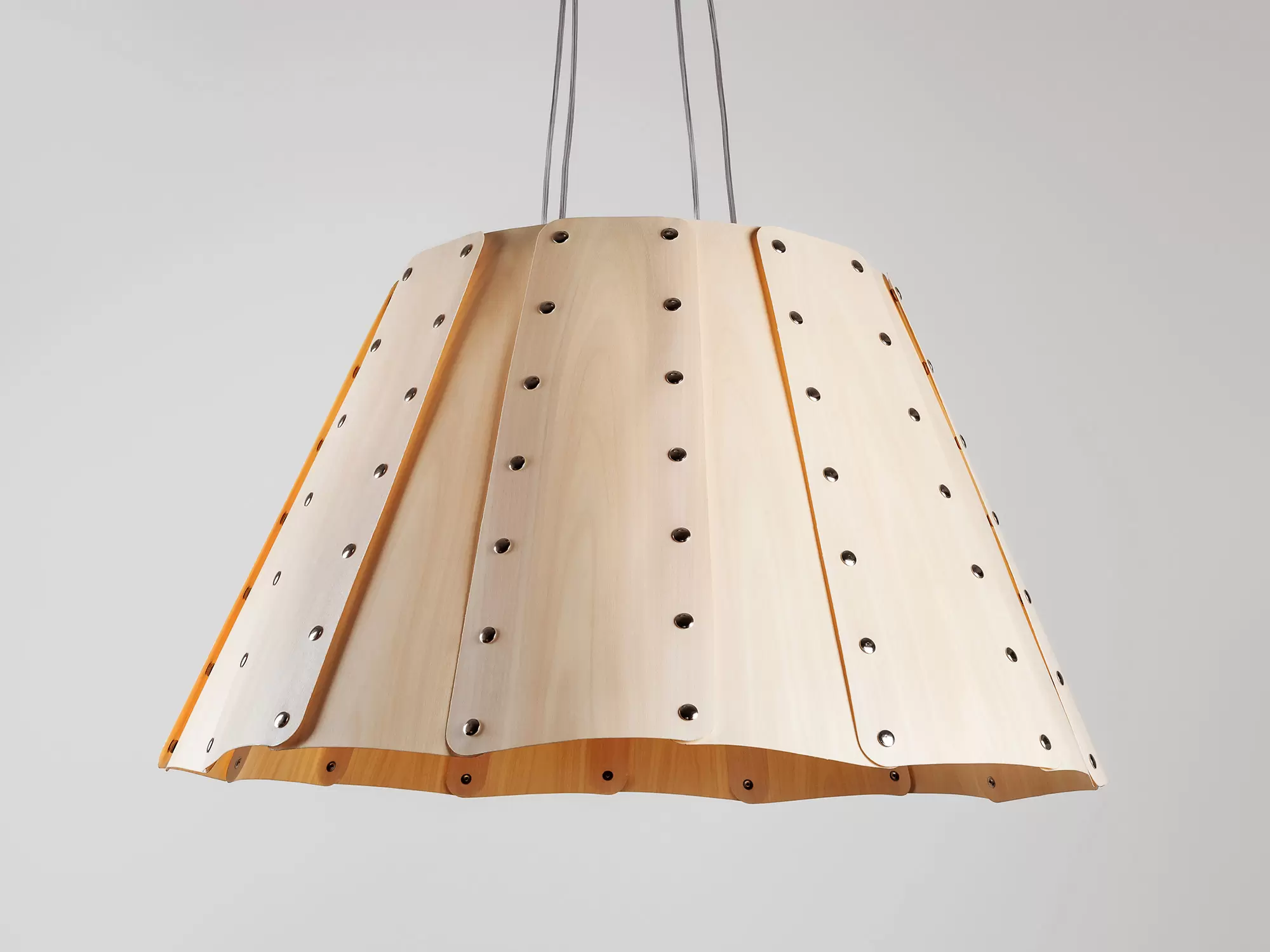 Colgante Rad 16. Esta familia reúne piezas metálicas con múltiples chapas de madera que resultan en una pantalla simple y moderna. Esta llamativa pieza está sujeta a un engranaje de madera que alberga a la parte eléctrica. La cantidad de chapas de madera empleadas determinan la versión de RAD, siendo estas de 8, 12 y 16 piezas respectivamente.