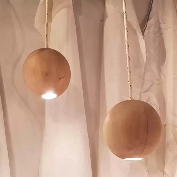 Colgante Rest es una luminaria esférica fabricada madera tallada de forma artesanal con florón color bronce.