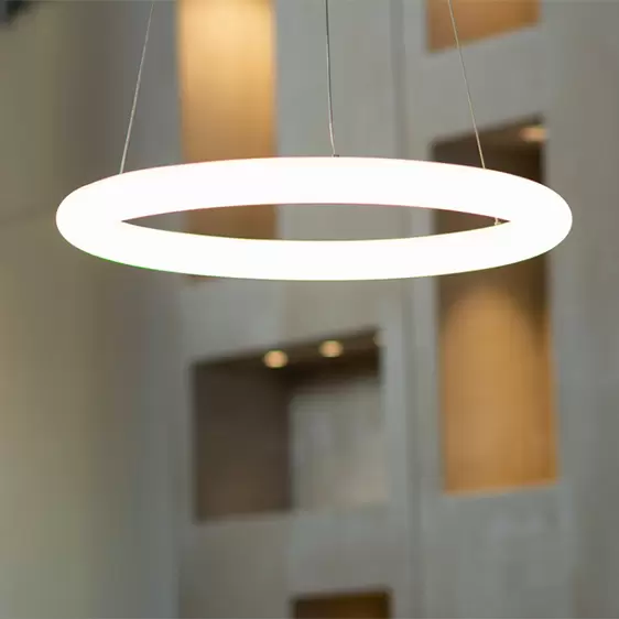 Colgante Rond suspendido decorativo de gran dimensión. Alta luminosidad, instalación sencilla. Distribución de luz simétrica-directa. Roto moldeado de PVC.