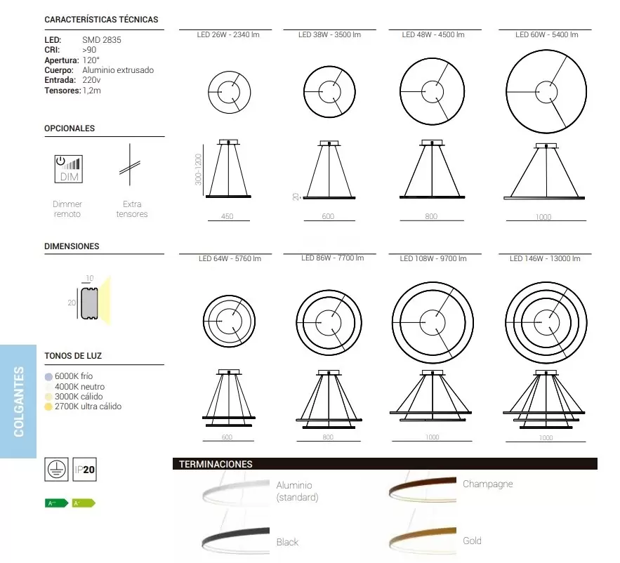 - Color: Aluminio anodizado, negro, blanco, cobre, bronce, cobre u oro