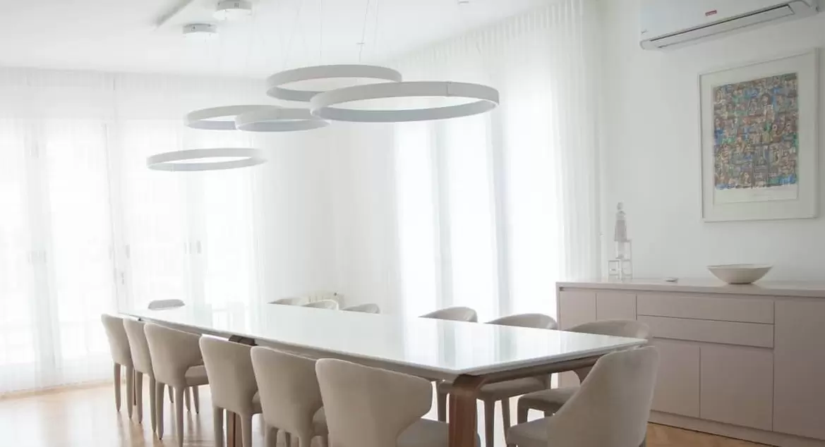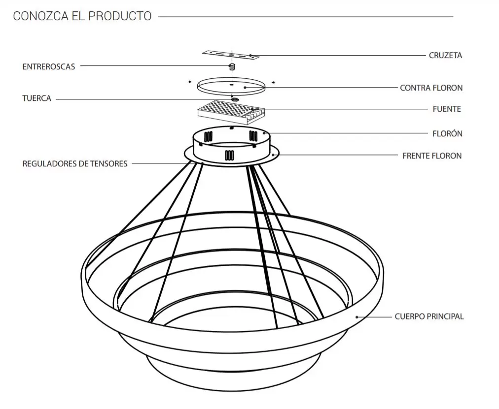 Colgante Saturno XL simple es una lámára ultra moderna de aluminio que ilumina desde su interior. Lámpara super personalizable respecto a color de led, largo de tensores, dimerización y color del artefacto.