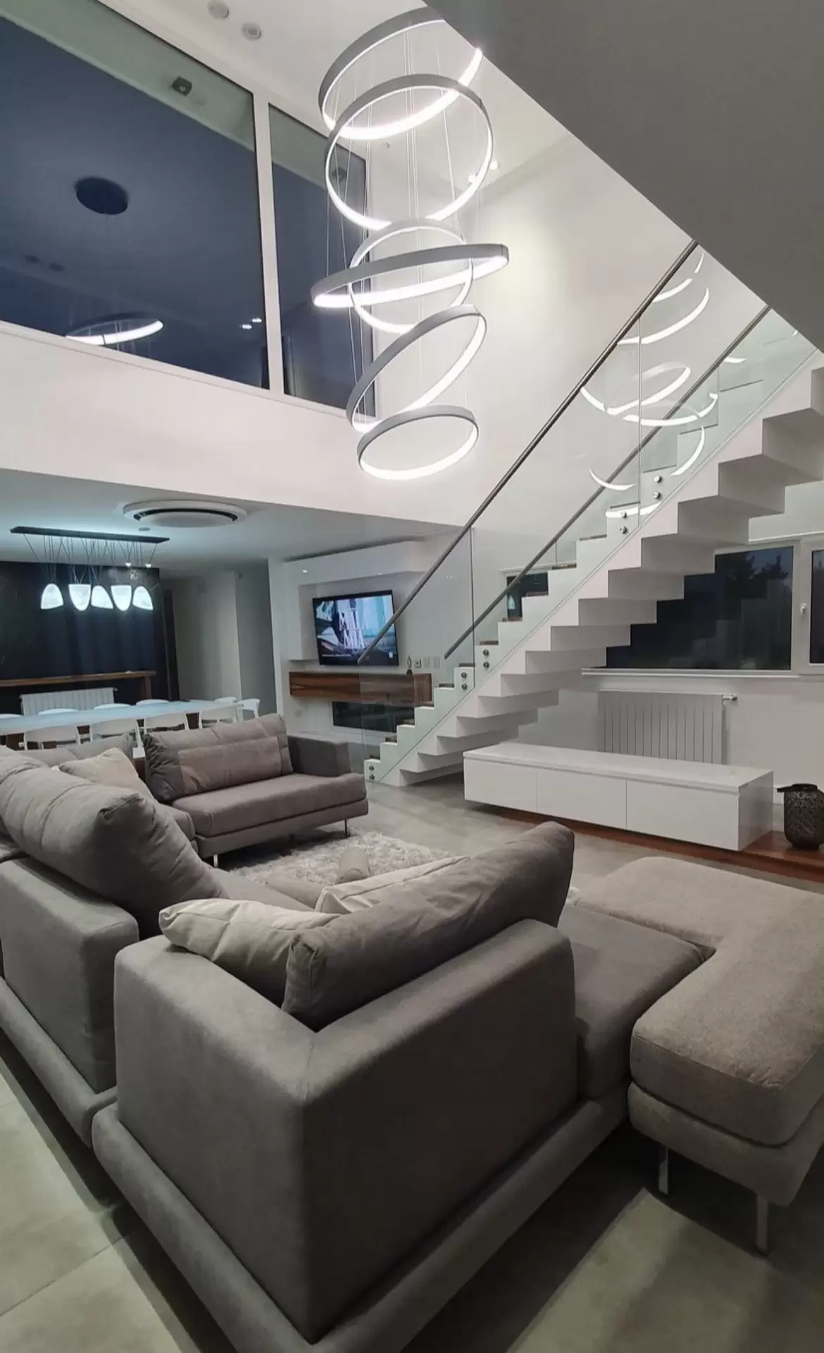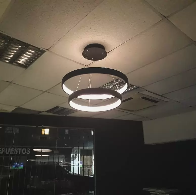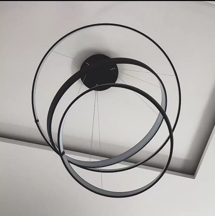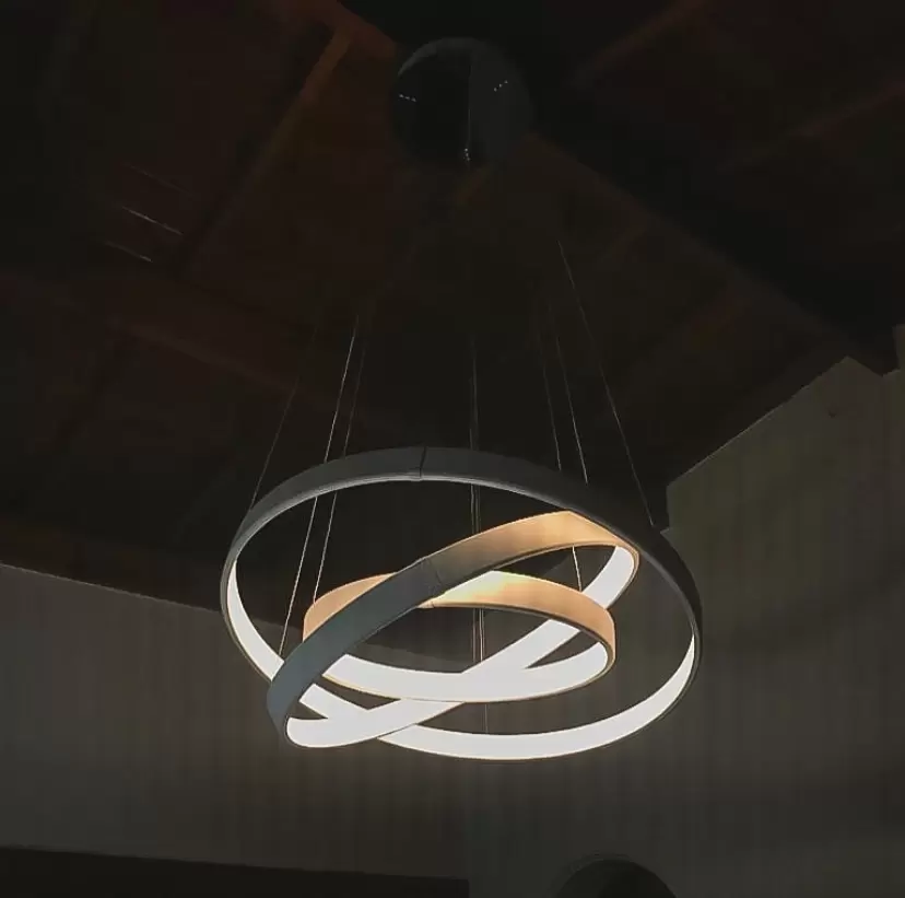 Colgante Saturno XL triple es una lámpara ultra moderna de aluminio que ilumina desde su interior. Lámpara super personalizable respecto a color de led, largo de tensores, dimerización y color del artefacto.