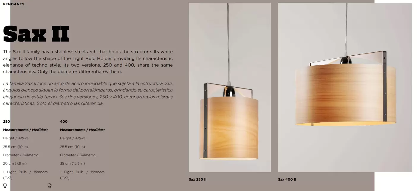 Colgante Sax 400 II. Esta familia de lámparas luce un arco de acero inoxidable que sujeta a la estructura. Sus ángulos blancos siguen la forma del portalámparas, brindando su característica elegancia de estilo tecno.