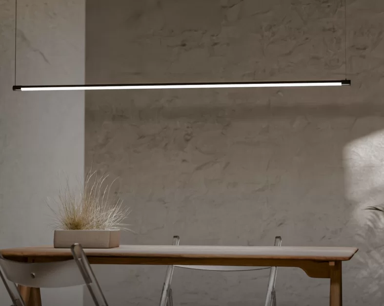 Colgante Stick H. Luminaria moderna lineal con LED integrado, disponible en 3 colores (aluminio, negro, blanco) y 3 tamaños (S, M y L).