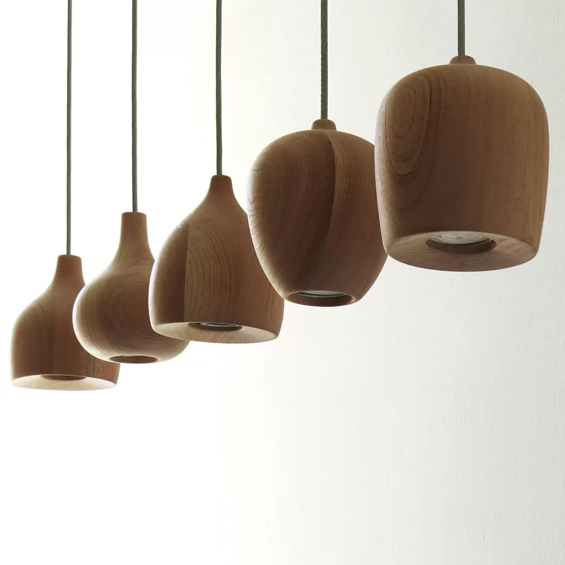 Colgante Suculentas es una luminaria cuádruple de madera de cedro torneada a mano de estilo nórdico disponible en color natural y negro