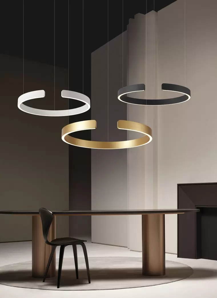 Colgante Toluca es una lámpara de techo en forma circular de estilo moderno. Viene en diferentes colores: blanco, negro o dorado y en dos tamaños.
