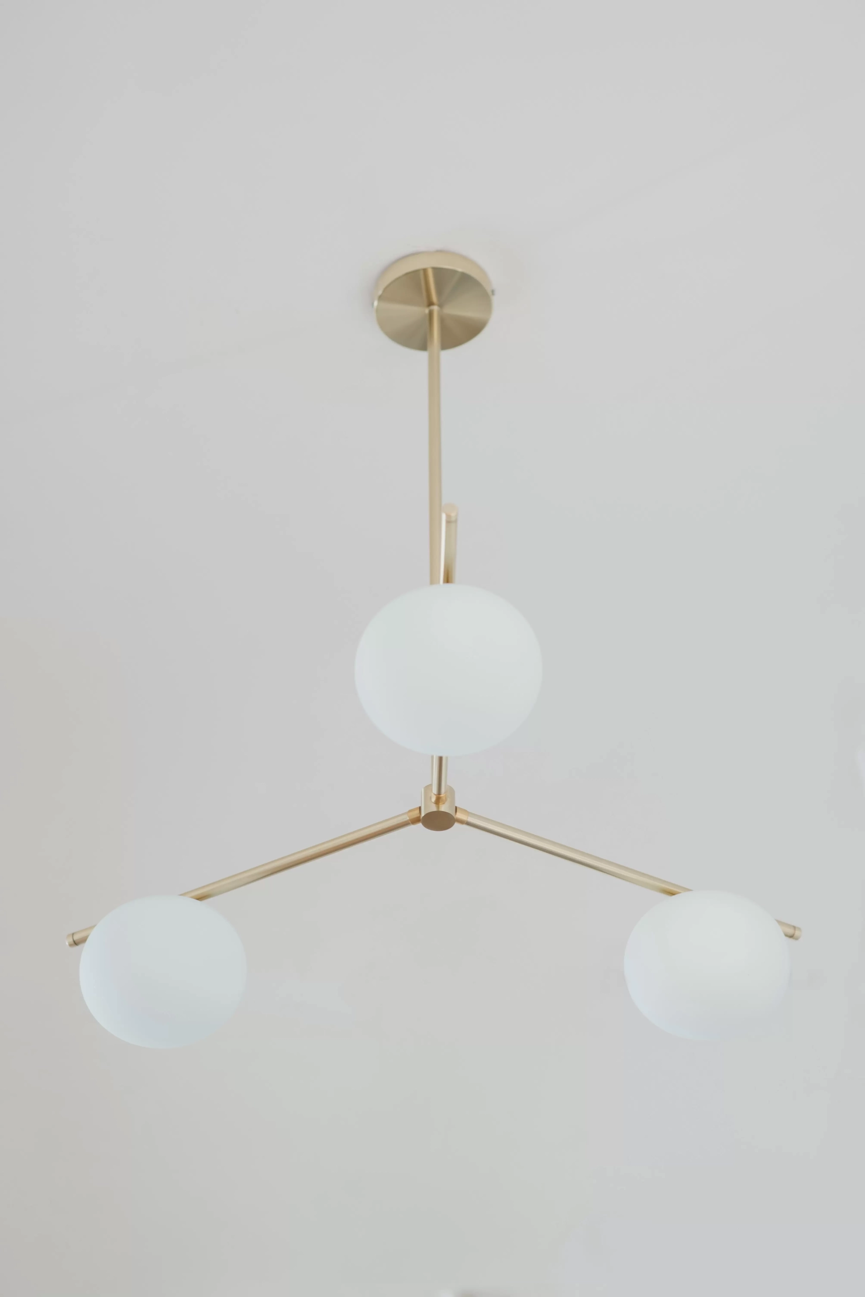 Colgante Trio. Luminaria de estilo moderno, fabricada en metal, de 3 luces con globos blanco opal. Disponible en color negro, blanco o bronce.