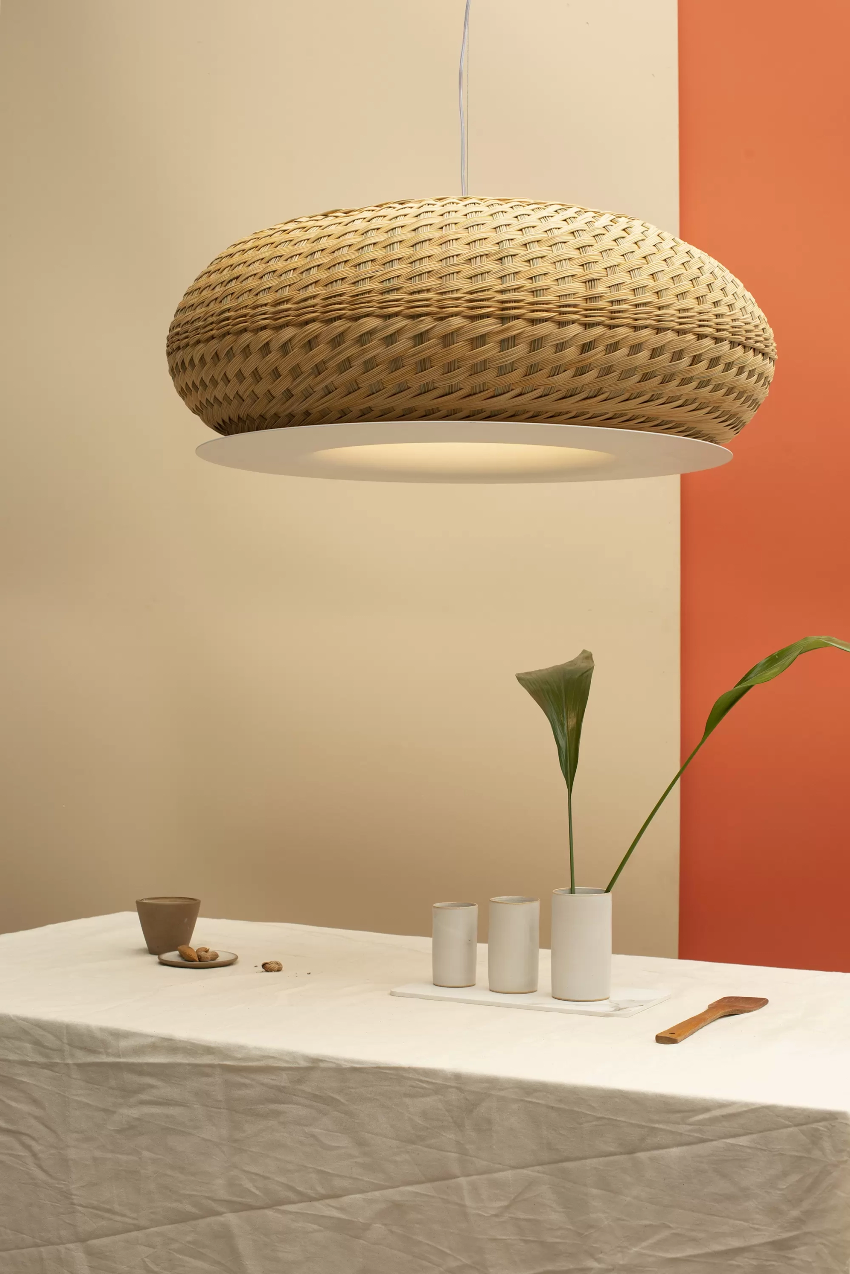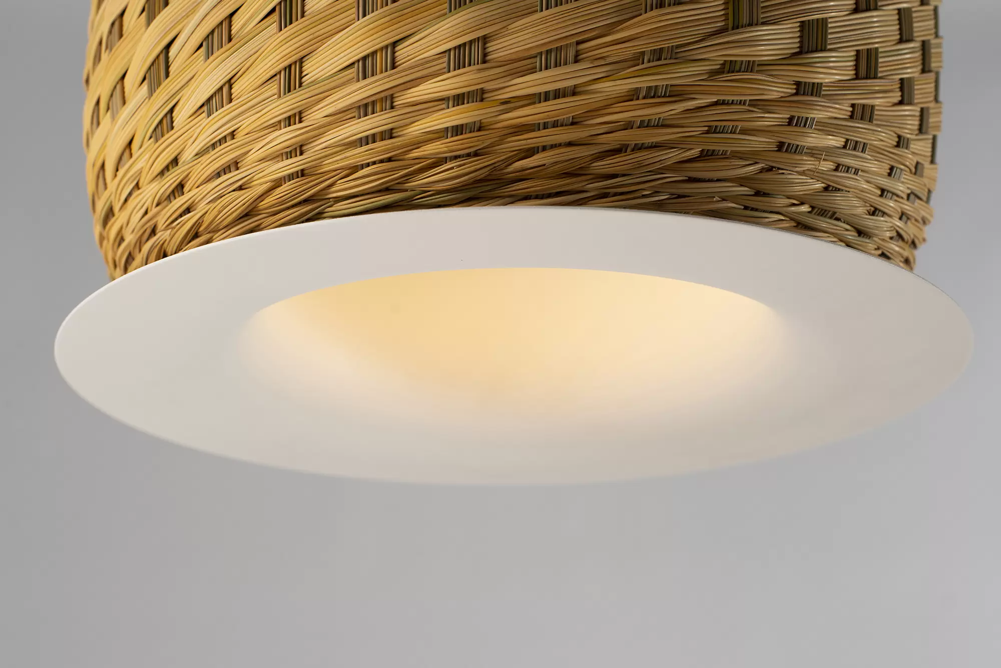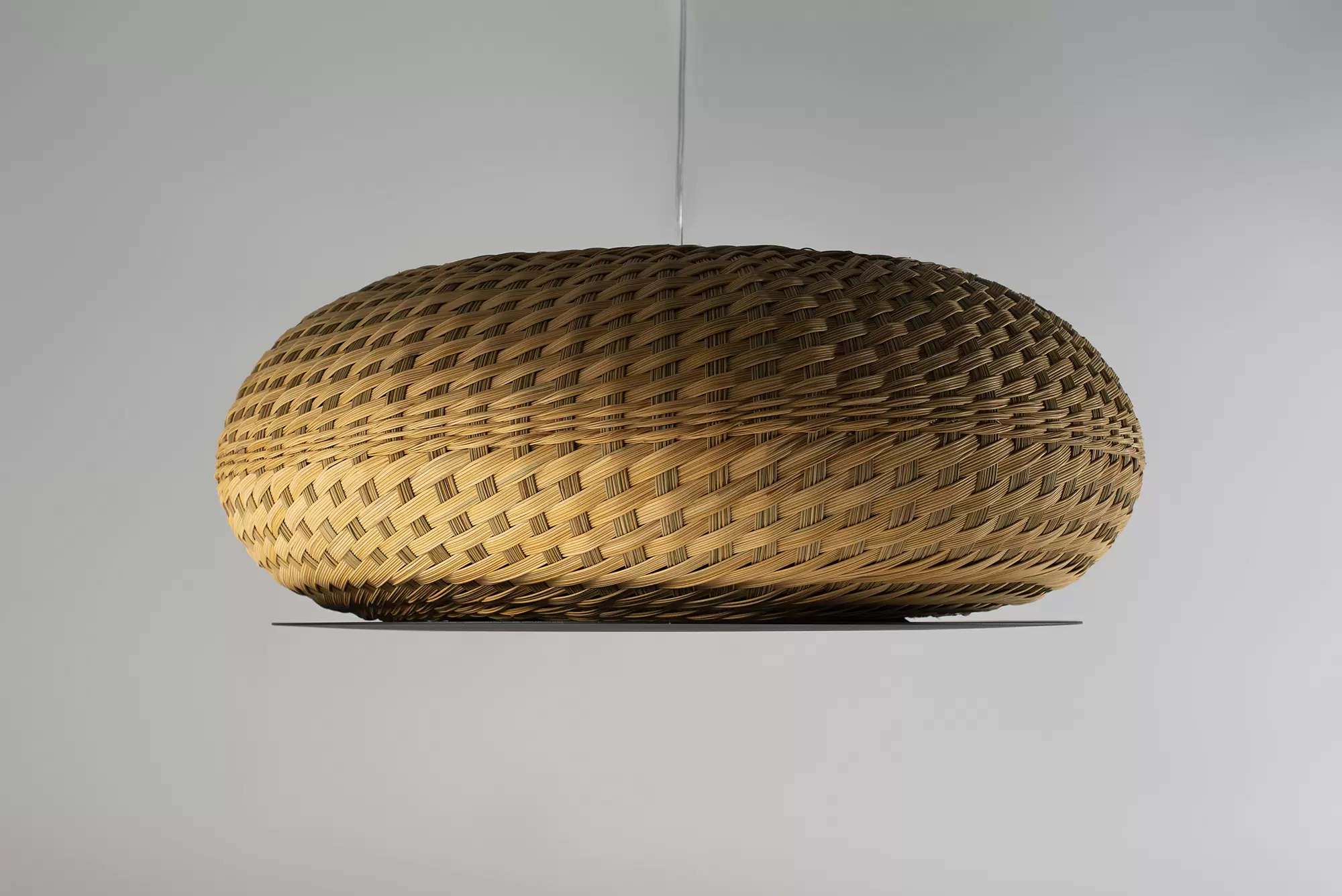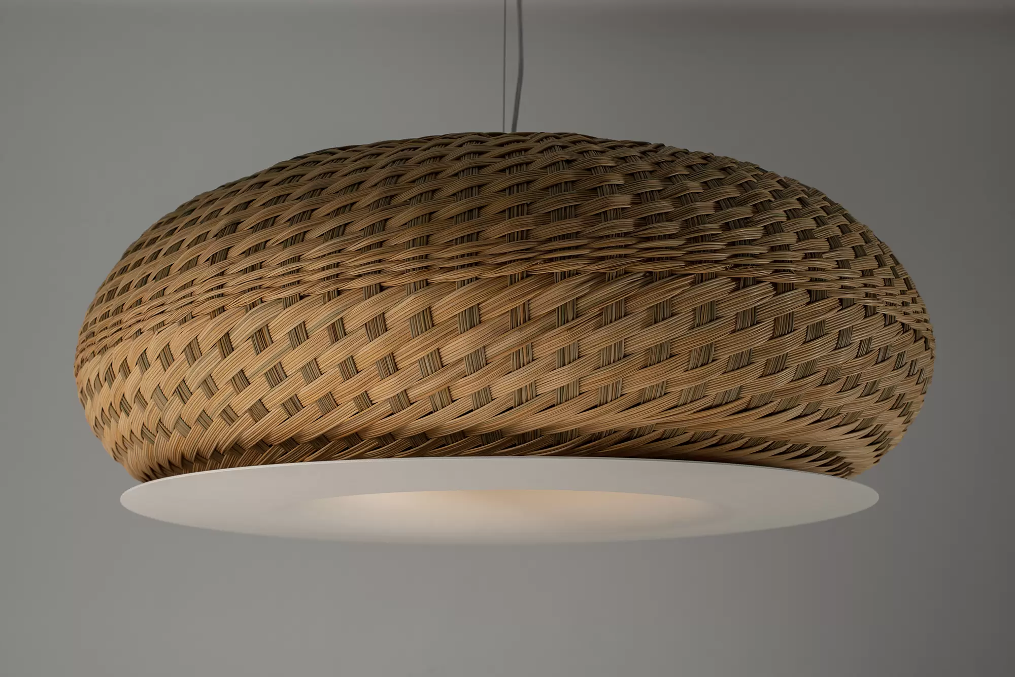 Colgante Valle es lámpara de suspensión de luz semi directa. Cuerpo en tejido de fibra natural “simbol” hecho a mano y disco de aluminio. Tensores de acero galvanizado y cable blanco o negro.