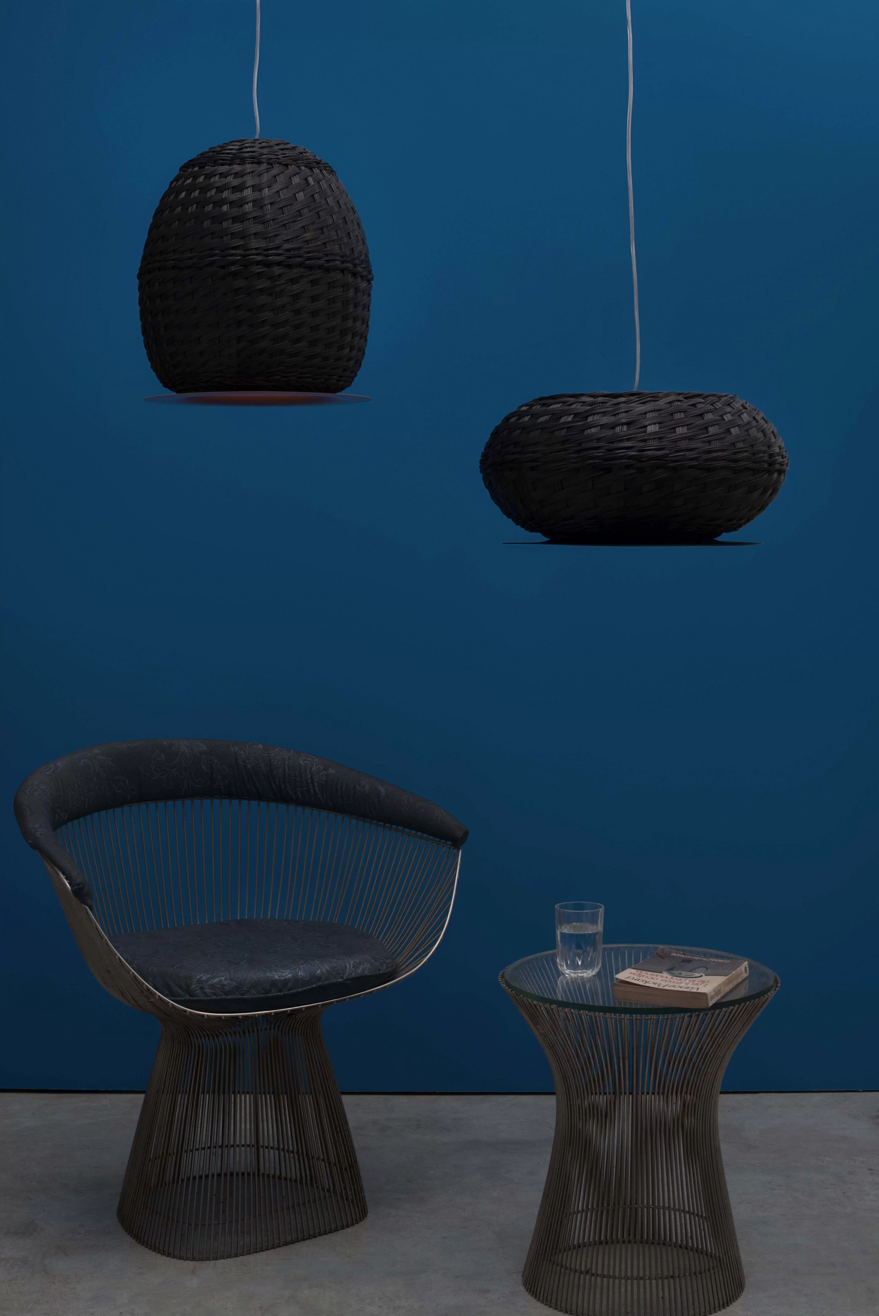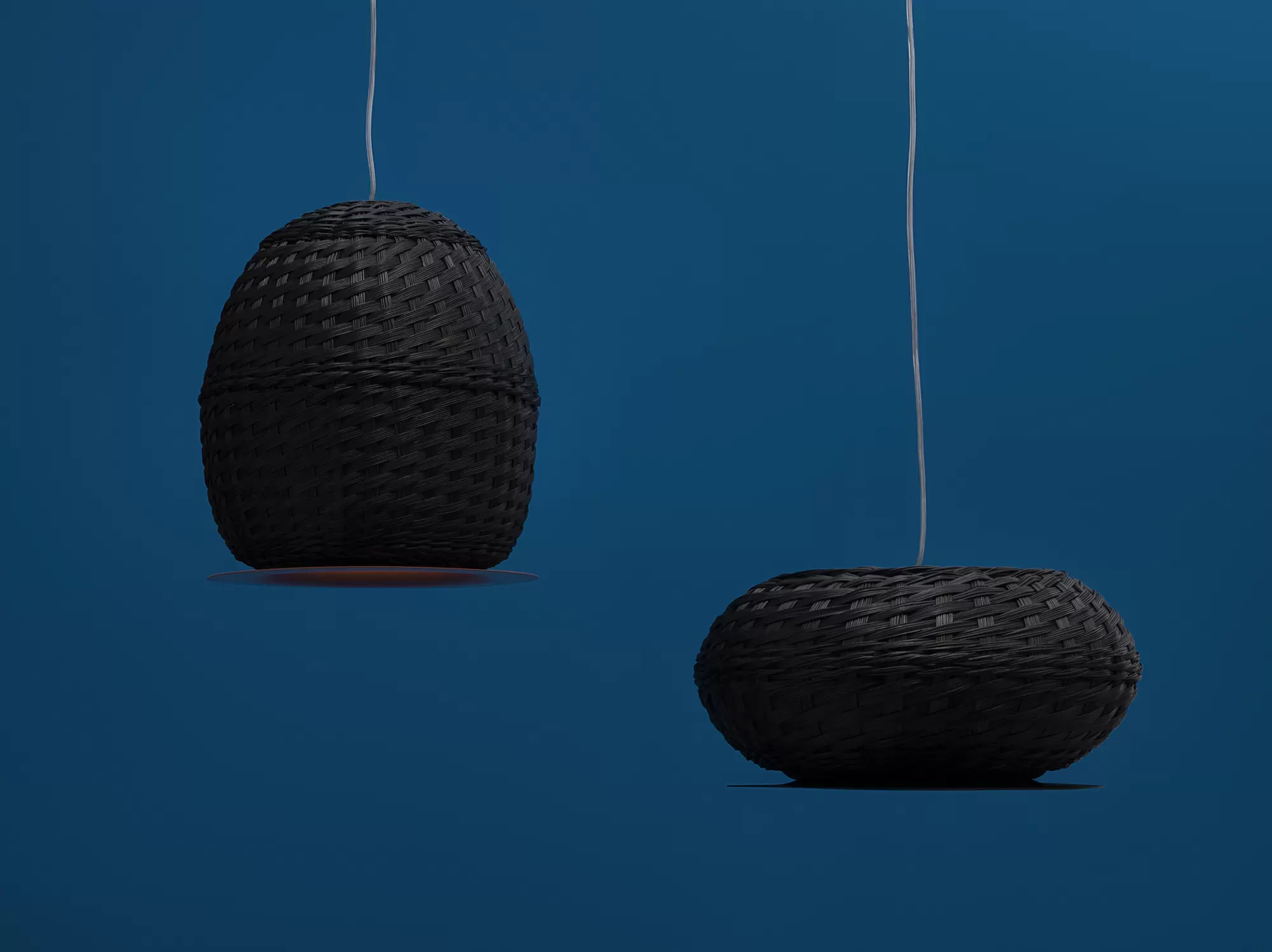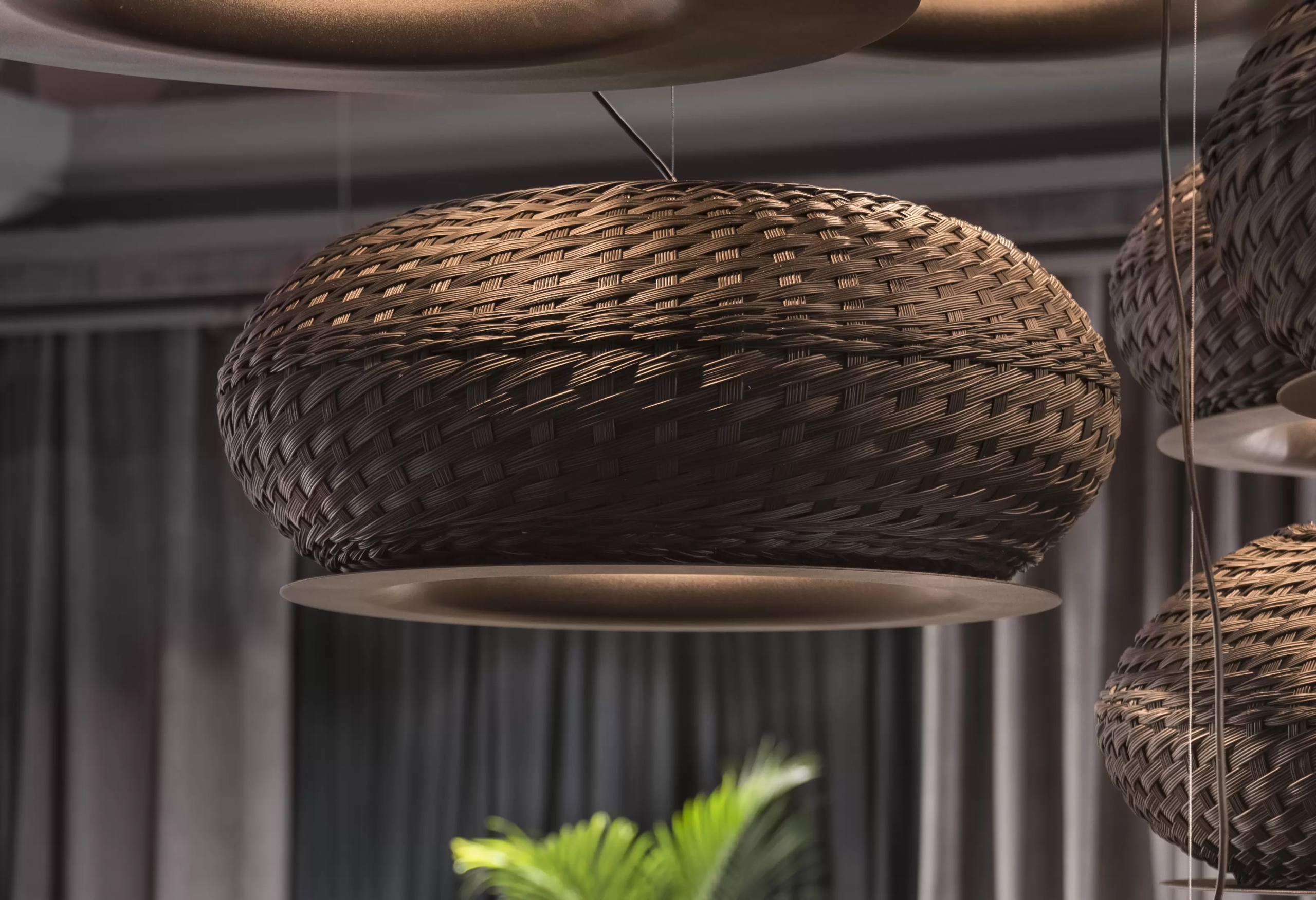 Colgante Valle es lámpara de suspensión de luz semi directa. Cuerpo en tejido de fibra natural “simbol” hecho a mano y disco de aluminio. Tensores de acero galvanizado y cable blanco o negro.