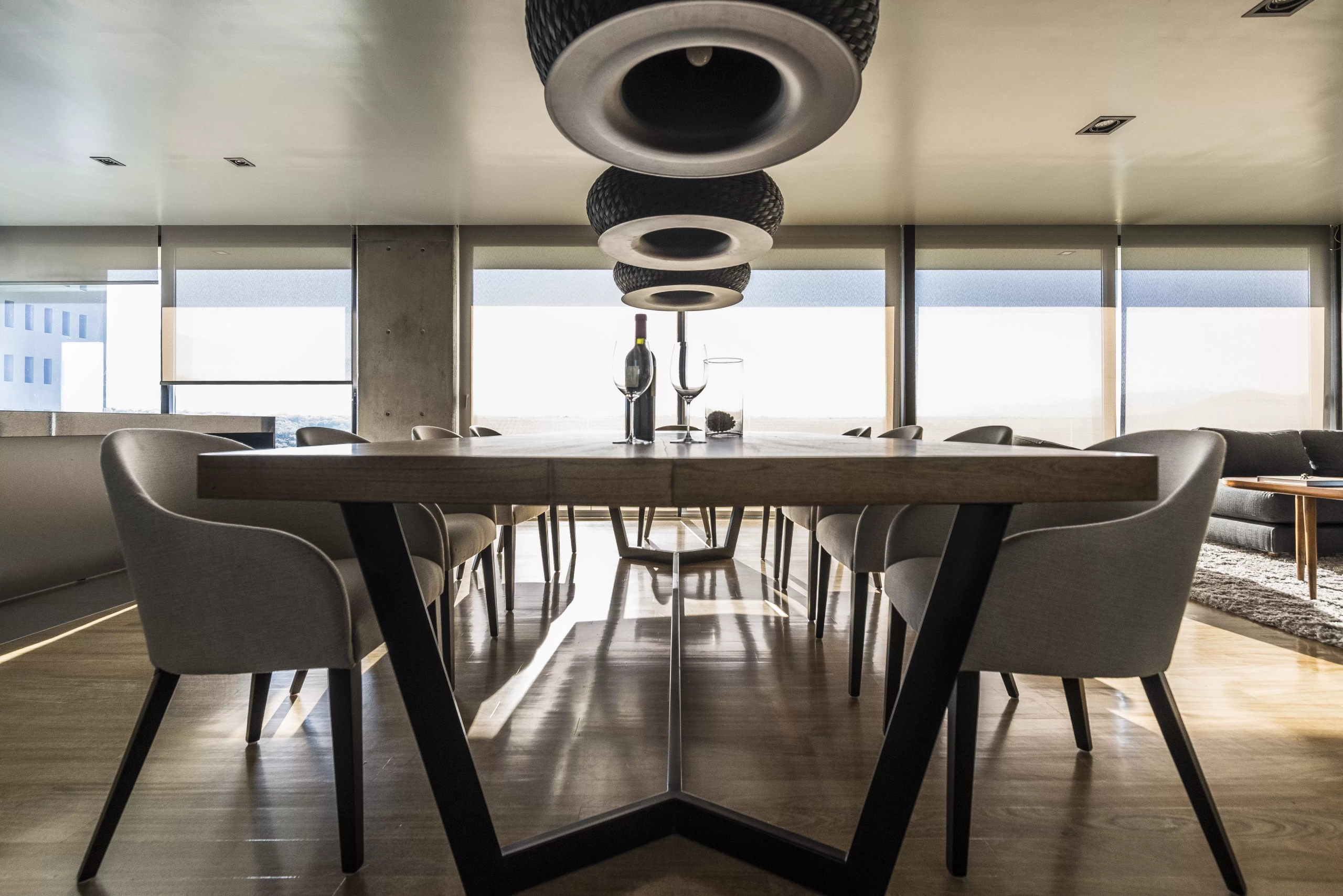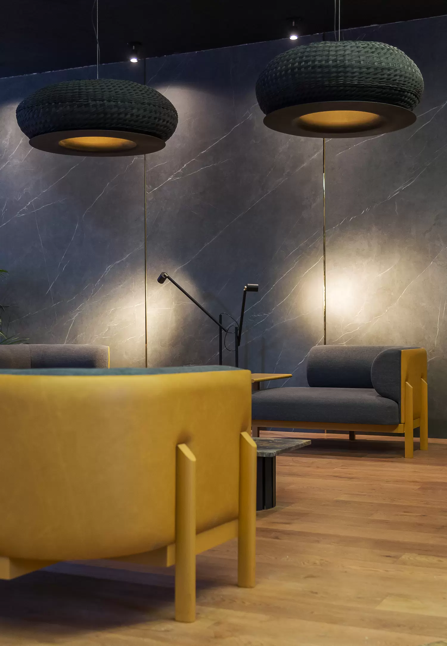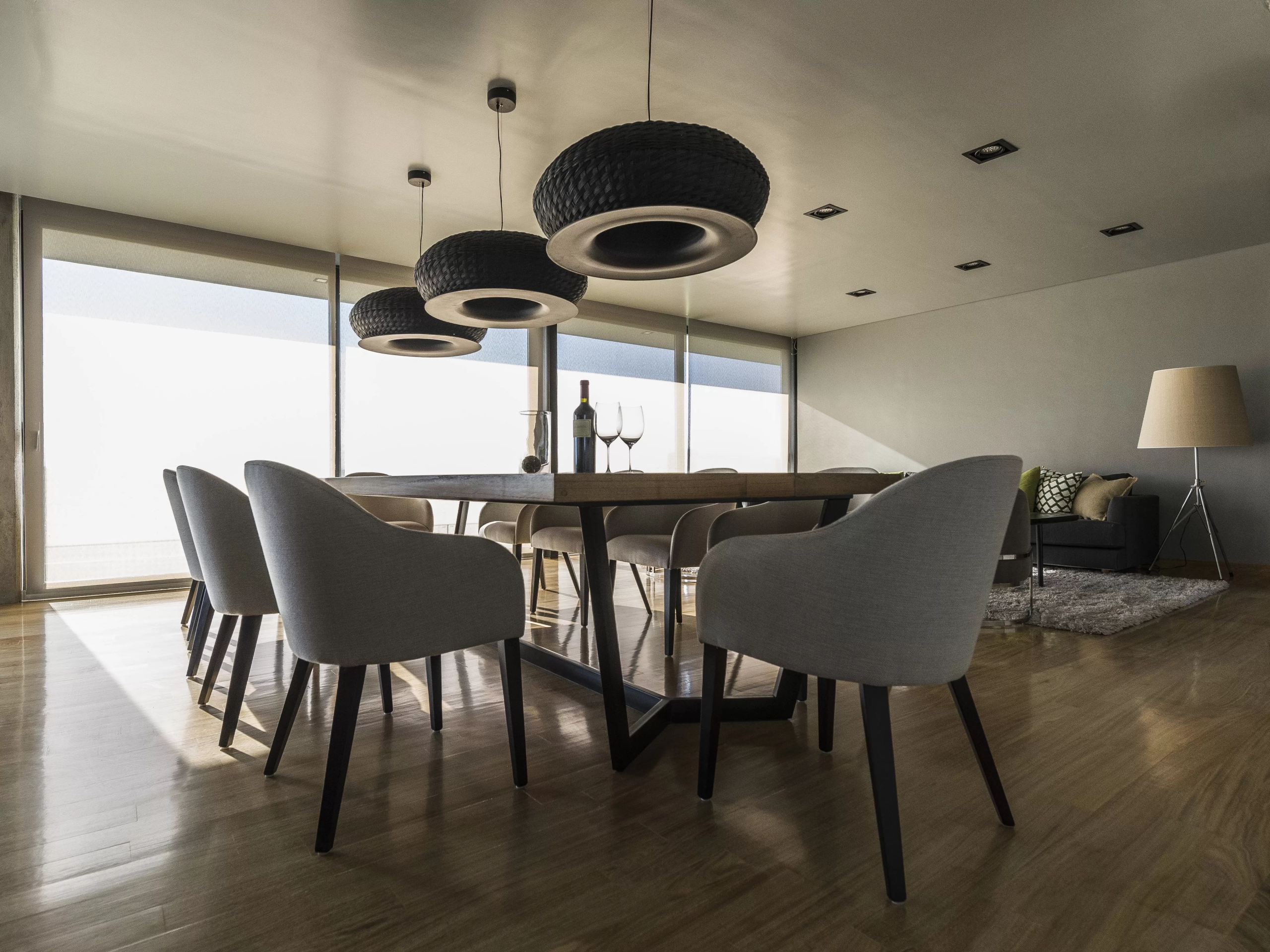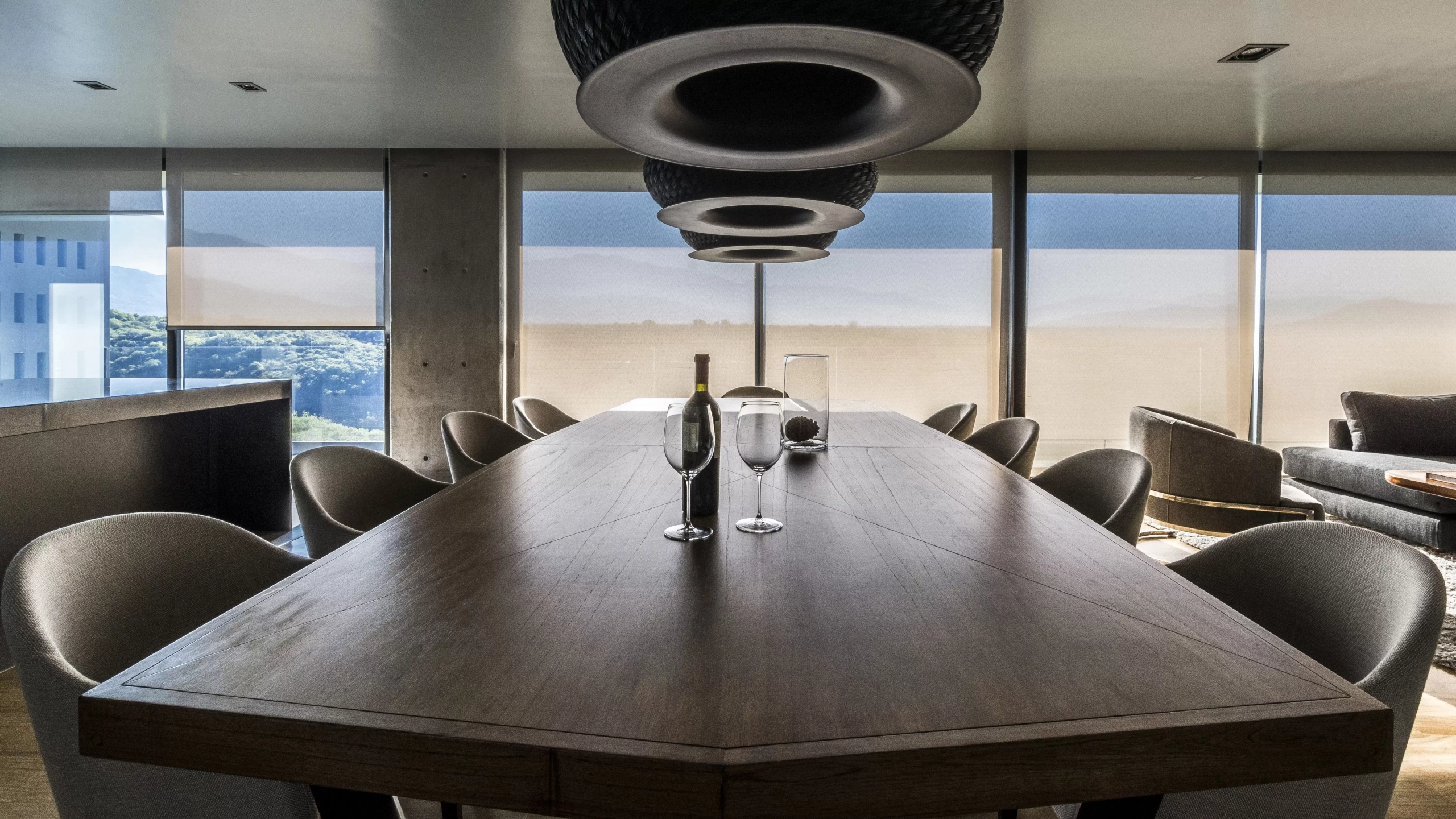 Colgante Valle es lámpara de suspensión de luz semi directa. Cuerpo en tejido de fibra natural “simbol” hecho a mano y disco de aluminio. Tensores de acero galvanizado y cable blanco o negro.